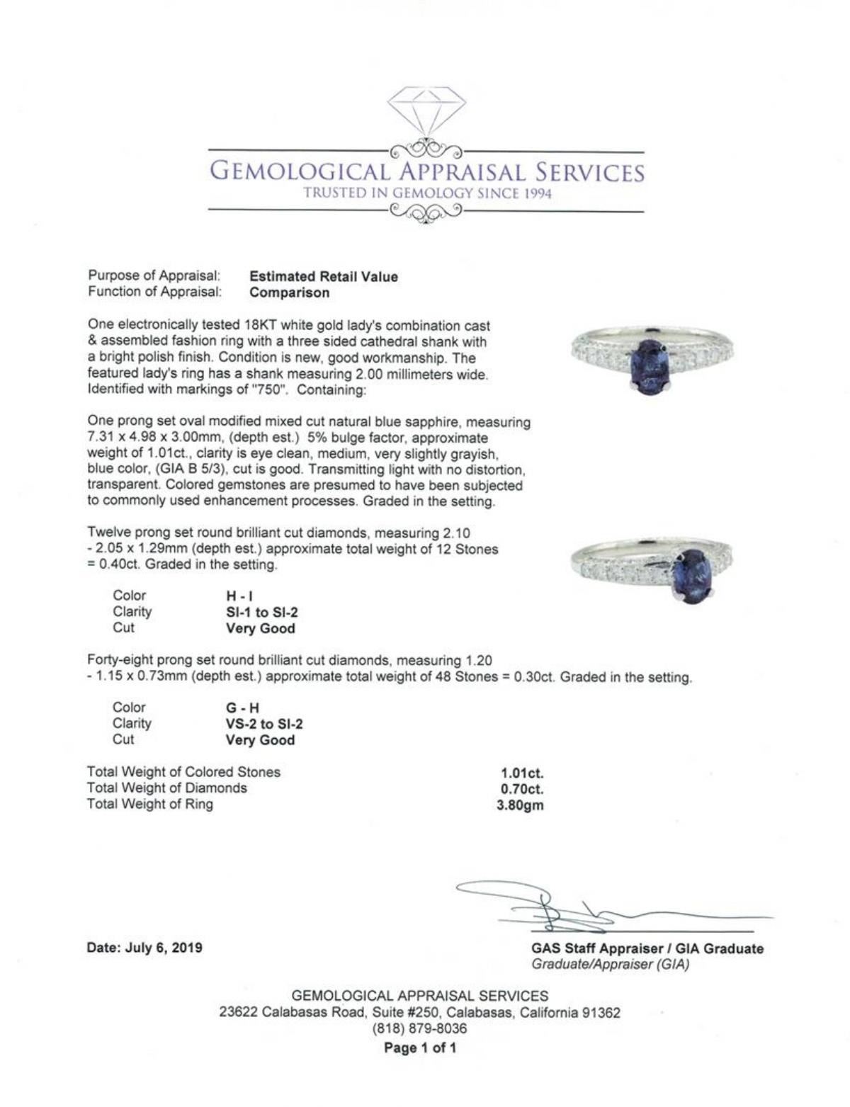 One electronically tested 18KT white gold lady's combination cast & assembled fashion ring with a three sided cathedral shank with a bright polish finish. The featured lady's ring has a shank measuring 2.00 millimeters wide. Identified with markings of '750'. Condition is new, good workmanship. Containing: One prong set oval modified mixed cut natural blue sapphire, measuring 7.31 x 4.98 x 3.00mm, (depth est.) 5%. bulge factor, approximate weight of 1.01ct., clarity is eye clean, medium, very slightly grayish, blue color, (GIA B 5/3), cut is good. Transmitting light with no distortion, transparent. Colored gemstones are presumed to have been subjected to commonly used enhancement processes. Graded in the setting. Twelve prong set round brilliant cut diamonds, measuring 2.10 - 2.05 x 1.29mm (depth est.) approximate total weight of 12 Stones = 0.40 ct. Graded in the setting. Color H - I Clarity SI-1 to SI-2 Cut Very Good Forty-Eight prong set round brilliant cut diamonds, measuring 1.20 - 1.15 x 0.73mm (depth est.) approximate total weight of 48 Stones = 0.30 ct. Graded in the setting. Color G - H Clarity VS-2 to SI-2 Cut Very Good. Total Weight of Colored Stones 1.01ct.. Total Weight of Diamonds 0.70 ct.. Total Weight of Ring 3.80gm GAS Appraised at  $4160.00. GAS Appraised.