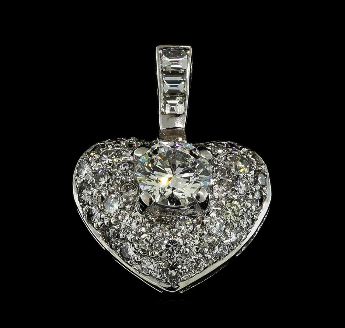 One electronically tested 18KT white gold ladies cast diamond heart pendant. The pendant features a diamond set within a diamond set heart curvature, completed by a diamond set rigid bail. Bright and patterned finish. Identified with markings of 'K18'. Condition is good. Containing: One prong set round brilliant cut diamond, measuring 6.00 - 6.00 x 3.50mm (depth est.) approximate weight of 0.77ct. Clarity SI-2. Color: G Depth 58.3%. Table: 58.3%. Three channel set square cut diamonds, measuring 2.25 x 2.00 x 1.24mm (depth est.) approximate total weight of 3 Stones = 0.14ct. Graded in the setting. Clarity SI-1 to SI-2. Color: G - H Forty prong set round brilliant cut diamonds, measuring 2.00 - 1.50 x 1.05mm (depth est.) approximate total weight of 40 Stones = 0.80ct. Graded in the setting. Clarity SI-1 to I-1. Color: G - H. Total Weight of Diamonds 1.71ct.. Total Weight of Pendant 3.14gm. AIG Appraised.