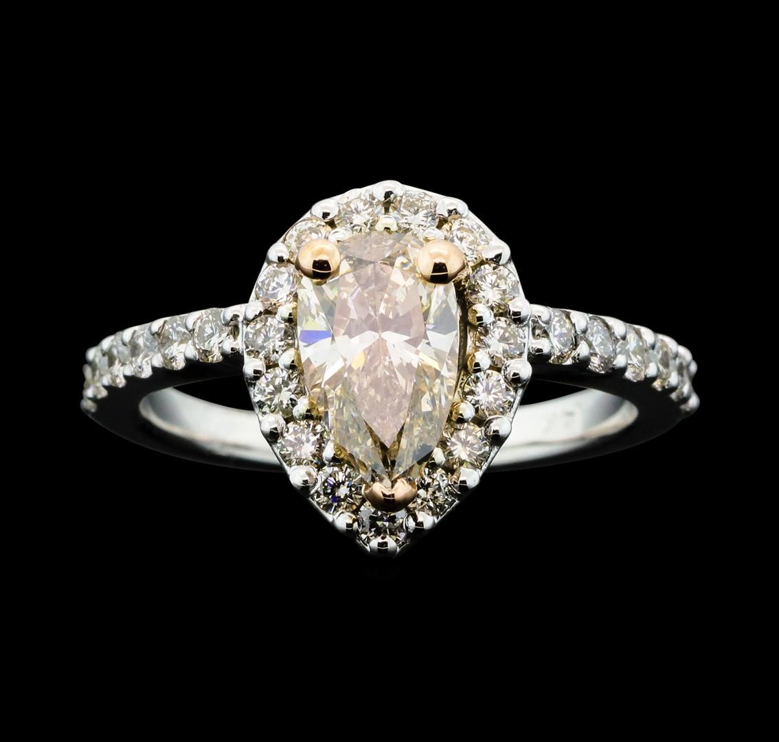 One electronically tested 14KT rose and white gold lady's combination cast & assembled wedding ring with a cathedral halo with a bright polish finish. The featured lady's ring has a shank measuring 1.94 millimeters wide. Identified with markings of '14K'. Condition is new, good workmanship. Containing: One prong set pear shaped cut diamond, measuring 9.00 x 5.35 x 3.50mm (depth est.) , 10.00.%. GTCF approximate weight of 1.09ct. Graded in the setting. Clarity SI-2 Cut Very Good Twenty-Six prong set round brilliant cut diamonds, measuring 1.90 - 1.80 x 1.15mm (depth est.) approximate total weight of 26 Stones = 0.62ct. Graded in the setting. Clarity SI-1 to SI-2. Color: H - I Cut Very Good. Total Weight of Diamonds 1.71ct.. Total Weight of Ring 4.40gm. GAS Appraised at $13,400.00.