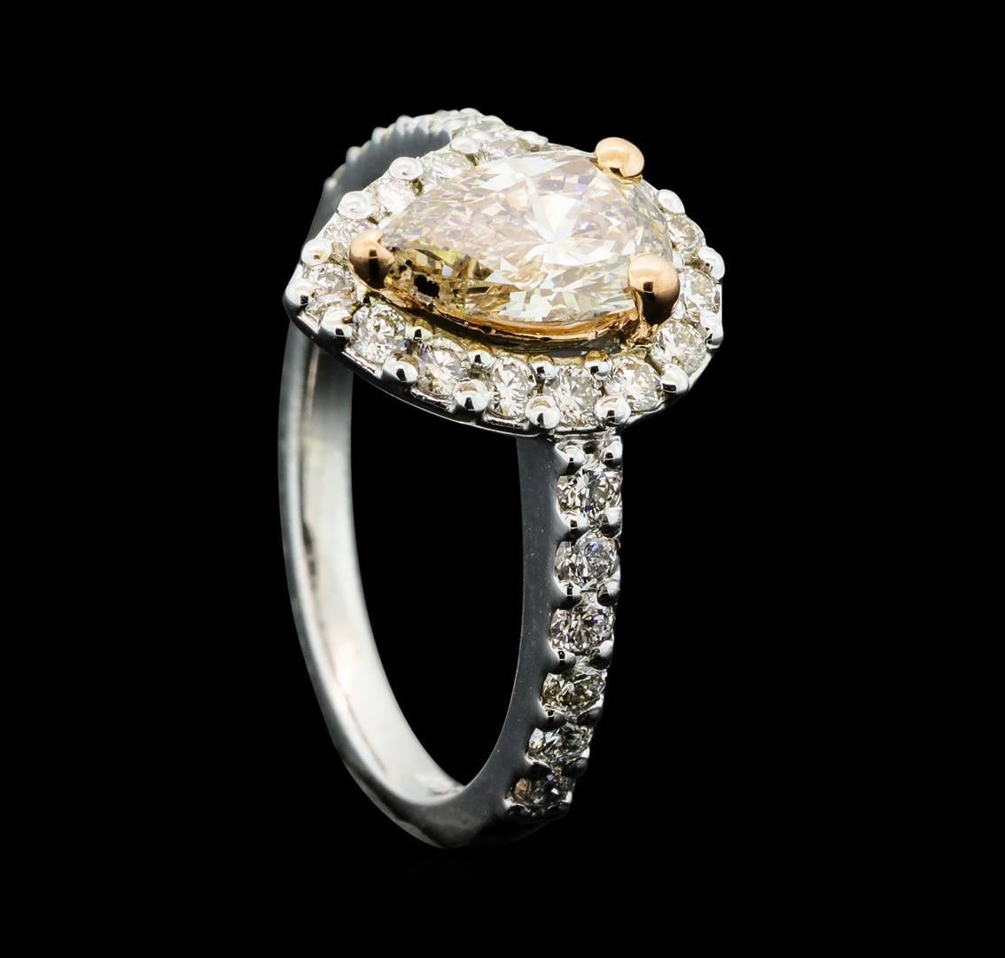 One electronically tested 14KT rose and white gold lady's combination cast & assembled wedding ring with a cathedral halo with a bright polish finish. The featured lady's ring has a shank measuring 1.94 millimeters wide. Identified with markings of '14K'. Condition is new, good workmanship. Containing: One prong set pear shaped cut diamond, measuring 9.00 x 5.35 x 3.50mm (depth est.) , 10.00.%. GTCF approximate weight of 1.09ct. Graded in the setting. Clarity SI-2 Cut Very Good Twenty-Six prong set round brilliant cut diamonds, measuring 1.90 - 1.80 x 1.15mm (depth est.) approximate total weight of 26 Stones = 0.62ct. Graded in the setting. Clarity SI-1 to SI-2. Color: H - I Cut Very Good. Total Weight of Diamonds 1.71ct.. Total Weight of Ring 4.40gm. GAS Appraised.