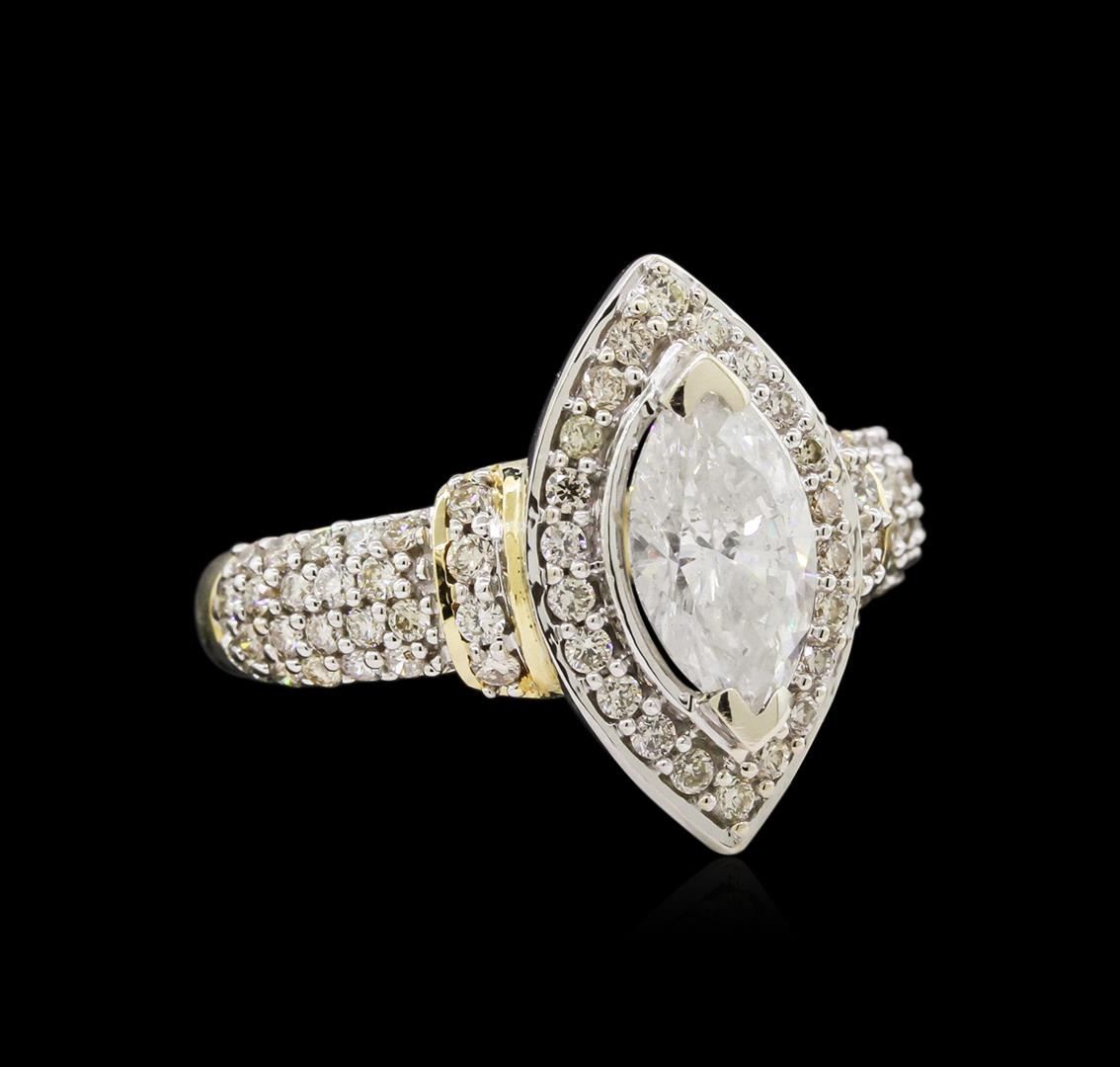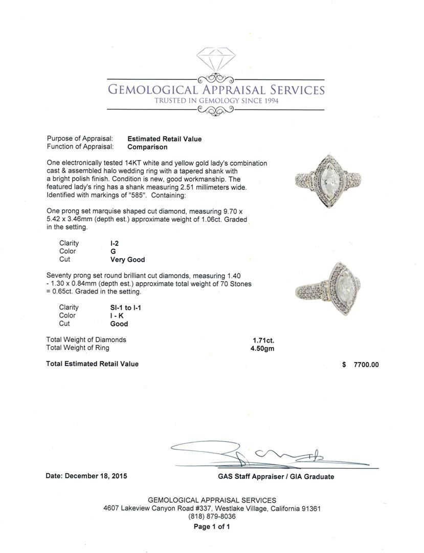 One electronically tested 14KT white and yellow gold lady's combination cast & assembled halo wedding ring with a tapered shank with a bright polish finish. The featured lady's ring has a shank measuring 2.51 millimeters wide. Identified with markings of "585". Condition is new, good workmanship. Containing: One prong set marquise shaped cut diamond, measuring 9.70 x 5.42 x 3.46mm (depth est.) approximate weight of 1.06ct. Graded in the setting. Clarity: I-2. Color: G. Cut Very Good Seventy prong set round brilliant cut diamonds, measuring 1.40 - 1.30 x 0.84mm (depth est.) approximate total weight of 70 Stones = 0.65ct. Graded in the setting. Clarity: SI-1 to I-1. Color: I - K. Cut Good. Total Weight of Diamonds 1.71ct. Total Weight of Ring 4.50gm. GAS Appraised at $7,700.00.
