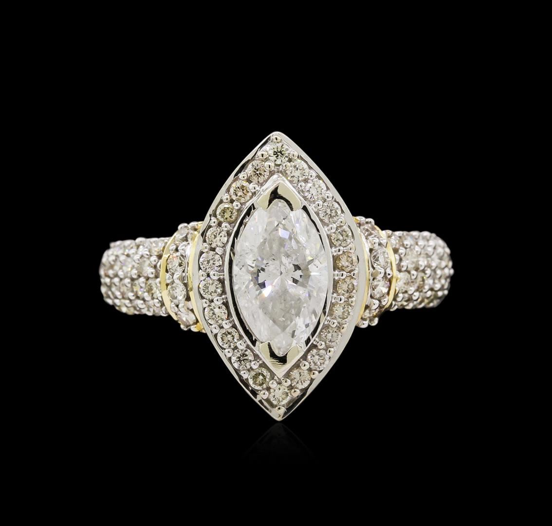 One electronically tested 14KT white and yellow gold lady's combination cast & assembled halo wedding ring with a tapered shank with a bright polish finish. The featured lady's ring has a shank measuring 2.51 millimeters wide. Identified with markings of "585". Condition is new, good workmanship. Containing: One prong set marquise shaped cut diamond, measuring 9.70 x 5.42 x 3.46mm (depth est.) approximate weight of 1.06ct. Graded in the setting. Clarity: I-2. Color: G. Cut Very Good Seventy prong set round brilliant cut diamonds, measuring 1.40 - 1.30 x 0.84mm (depth est.) approximate total weight of 70 Stones = 0.65ct. Graded in the setting. Clarity: SI-1 to I-1. Color: I - K. Cut Good. Total Weight of Diamonds 1.71ct. Total Weight of Ring 4.50gm. GAS Appraised at $7,700.00.
