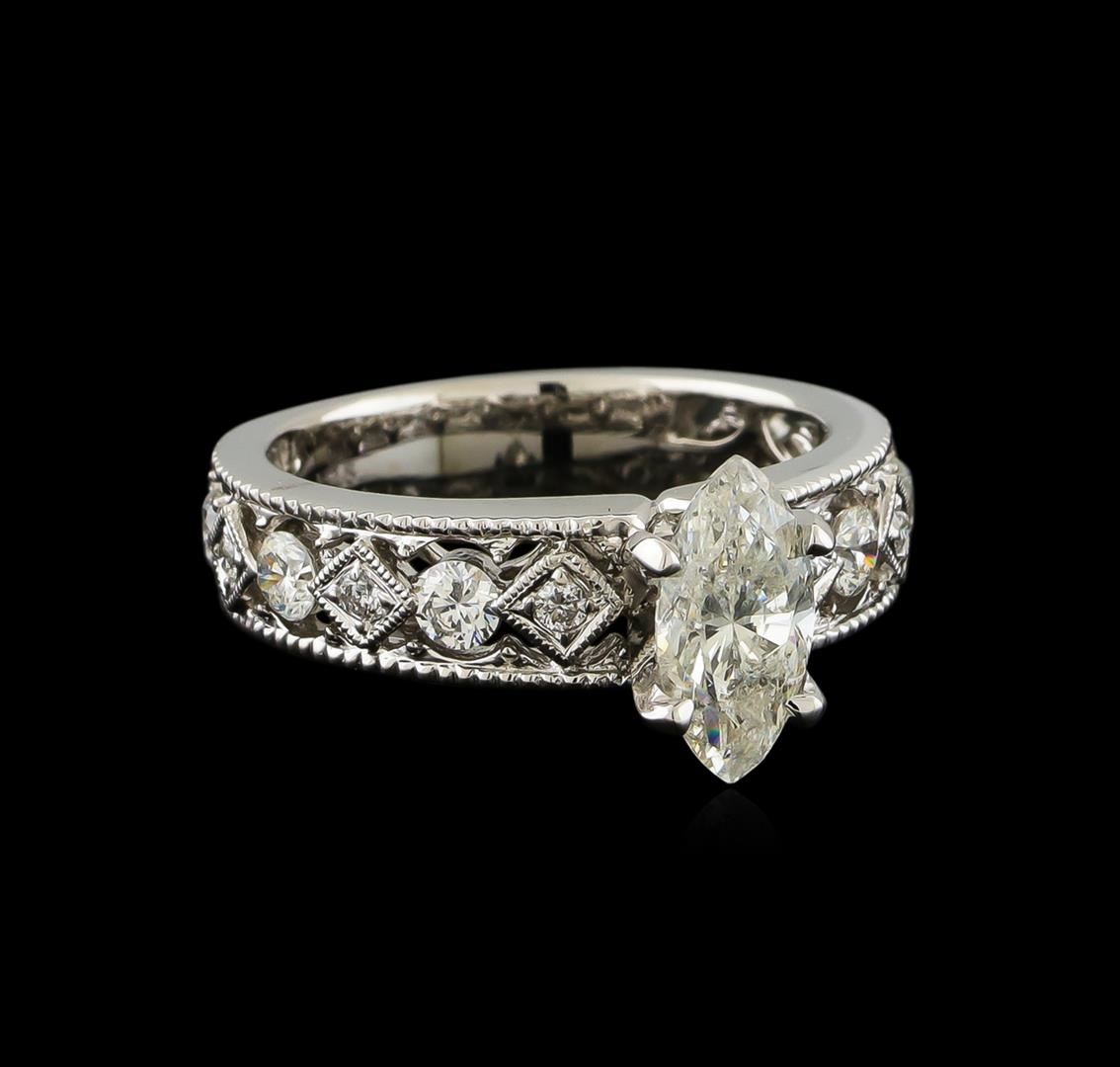 One electronically tested 18KT white gold lady's cast wedding ring with a bright polish with milgrain detailing finish. The featured lady's ring has a shank measuring 4.45 millimeters wide. Identified with markings of "K18". Condition is new, good workmanship. Containing: One prong set marquise shaped cut diamond, measuring 10.07 x 5.06 x 3.54mm (depth est.) , 10.00.%. GTCF approximate weight of 1.16ct. Graded in the setting. Clarity: I-1. Color: H - I. Cut Good Six prong set round brilliant cut diamonds, measuring 2.90 - 2.70 x 1.68mm (depth est.) approximate total weight of 6 Stones = 0.48ct. Graded in the setting. Clarity: VS-2 to SI-1. Color: G - Excellent Eight prong set round brilliant cut diamonds, measuring 1.40 - 1.30 x 0.81mm (depth est.) approximate total weight of 8 Stones = 0.07ct. Graded in the setting. Clarity: SI-1 to I-1. Color: G - Good. Total Weight of Diamonds 1.71ct. Total Weight of Ring 6.50gm GAS Appraised at $10,315.00.