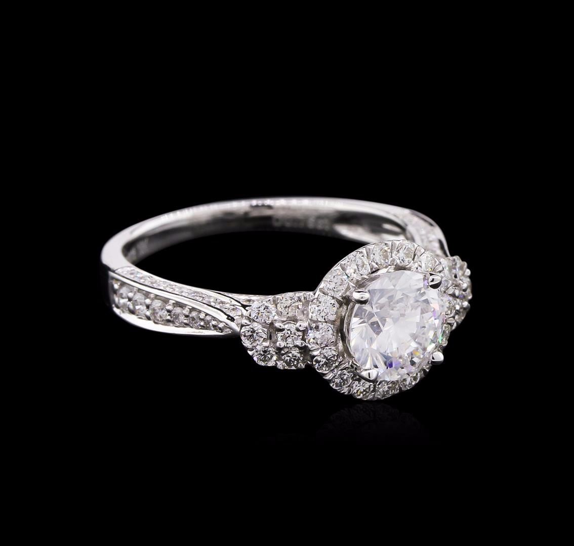 One electronically tested 18KT white gold ladies cast diamond unity ring with a bright polish finish. The featured diamond is set within a diamond bezel supported by elaborate diamond set shoulders, completed by a two millimeter wide band. Trademark is Orianne. Identified with markings of "18K". Condition is new, good workmanship. Containing: One prong set round brilliant cut diamond, measuring 6.34 - 6.32 x 3.90mm (depth est.), 1.05%. GTCF approximate weight of 0.96ct. Graded in the setting. Clarity: I-1. Color: F. Depth 61.6%. Table 60.0%. One Hundred Eight prong set round brilliant cut diamonds (depth est.) approximate total weight of 108 Stones = 0.75ct. Graded in the setting. Clarity: VS-2 to SI-2. Color: G - H. Total Weight of Diamonds 1.71ct. AIG Appraised at $16,770.00.