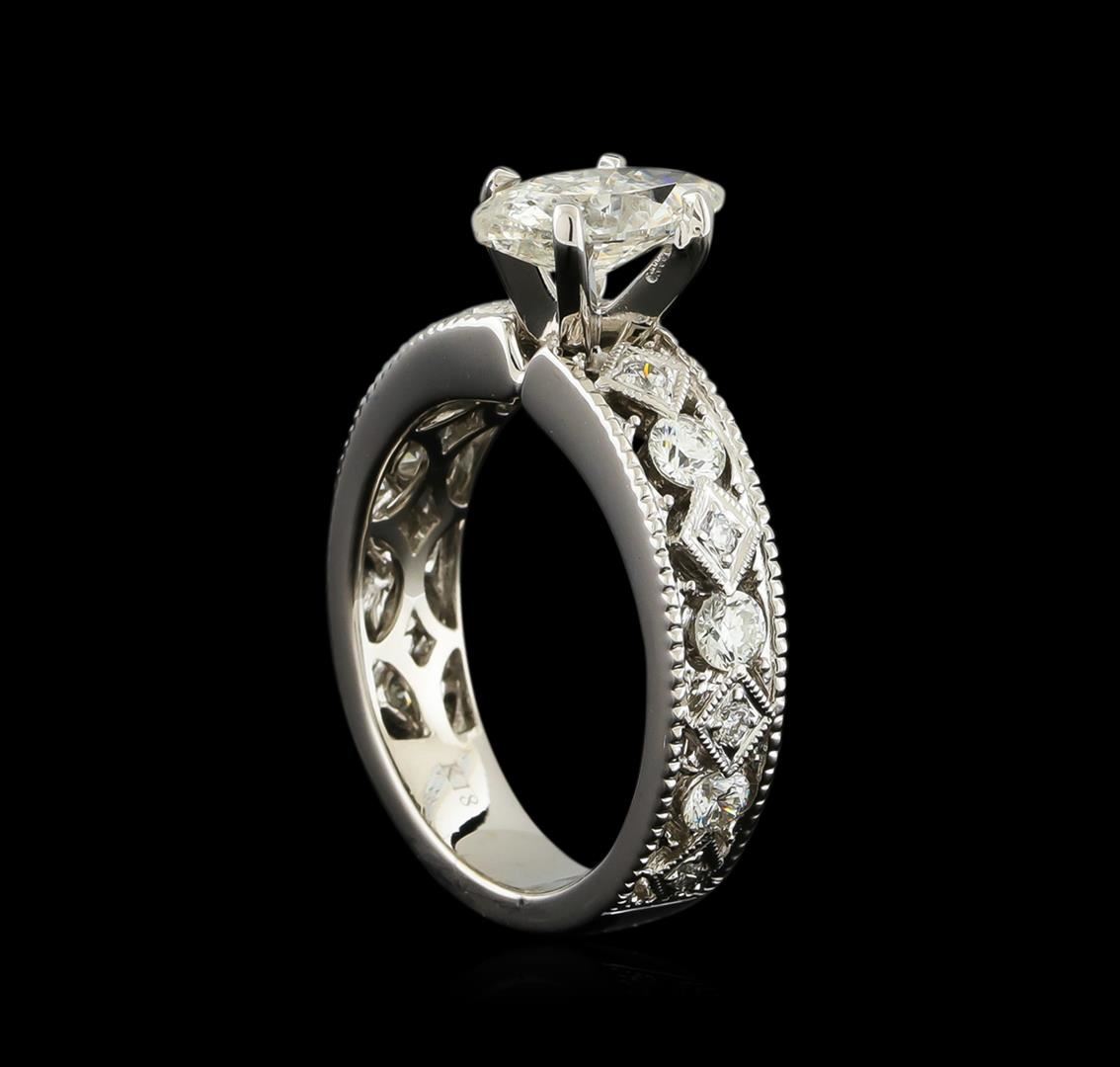 One electronically tested 18KT white gold lady's cast wedding ring with a bright polish with milgrain detailing finish. The featured lady's ring has a shank measuring 4.45 millimeters wide. Identified with markings of "K18". Condition is new, good workmanship. Containing: One prong set marquise shaped cut diamond, measuring 10.07 x 5.06 x 3.54mm (depth est.) , 10.00.%. GTCF approximate weight of 1.16ct. Graded in the setting. Clarity: I-1. Color: H - I. Cut Good Six prong set round brilliant cut diamonds, measuring 2.90 - 2.70 x 1.68mm (depth est.) approximate total weight of 6 Stones = 0.48ct. Graded in the setting. Clarity: VS-2 to SI-1. Color: G - Excellent Eight prong set round brilliant cut diamonds, measuring 1.40 - 1.30 x 0.81mm (depth est.) approximate total weight of 8 Stones = 0.07ct. Graded in the setting. Clarity: SI-1 to I-1. Color: G - Good. Total Weight of Diamonds 1.71ct. Total Weight of Ring 6.50gm GAS Appraised at $10,315.00.