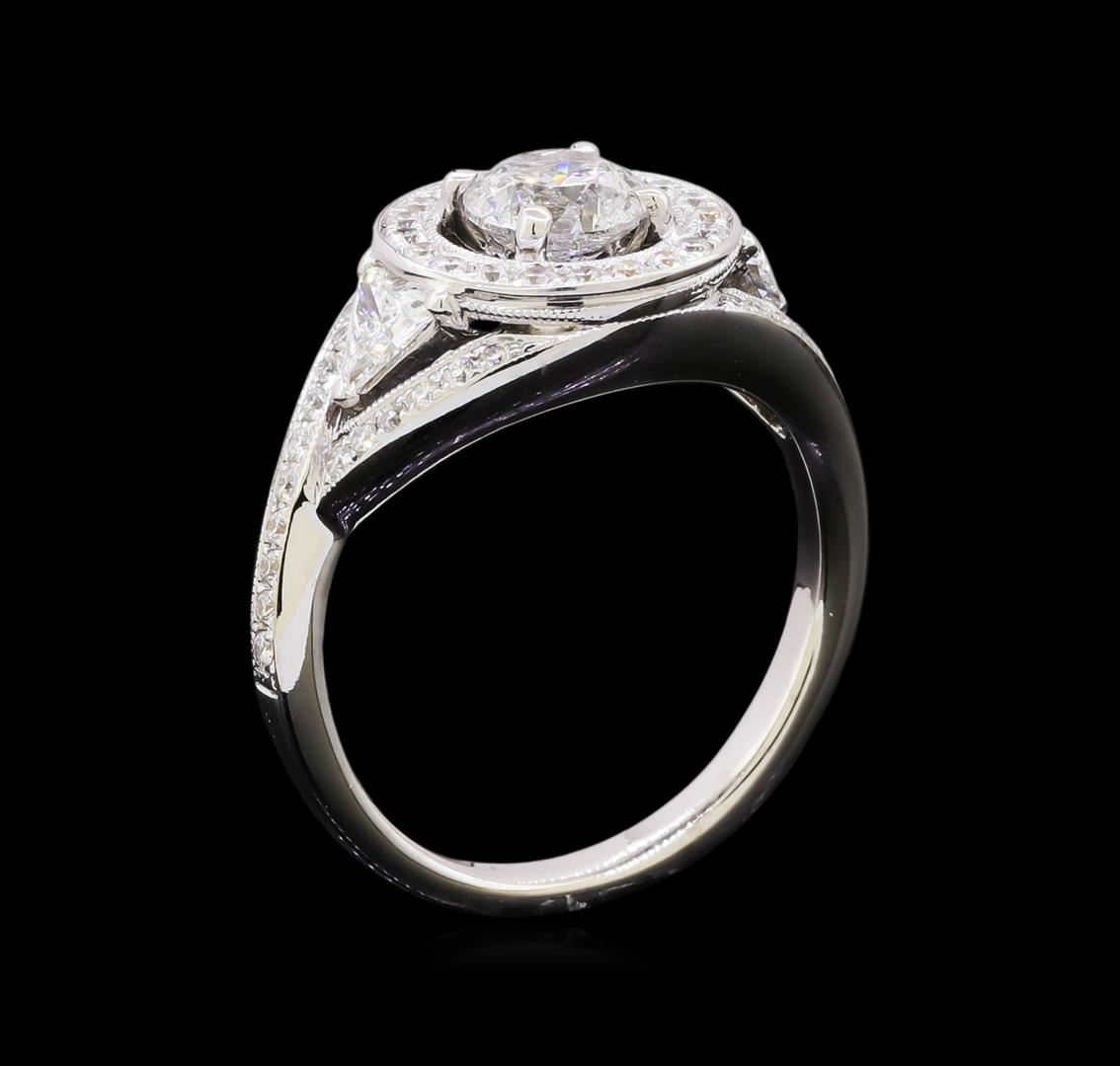 One electronically tested 18KT white gold lady's cast bypass wedding ring with a halo with a bright polish with milgrain detailing finish. The featured lady's ring has a shank measuring 2.12 millimeters in width. Identified with markings of "750". Condition is like new, good workmanship. Containing: One prong set round brilliant cut diamond, measuring 5.54 - 5.52 x 3.80mm (depth est.) approximate weight of 0.71ct. Graded in the setting. Clarity: I-1. Color: G - Good Two prong set triangle brilliant cut diamonds, measuring 4.00 x 3.90 x 2.20mm (depth est.) approximate total weight of 2 Stones = 0.40ct. Graded in the setting. Clarity: VS-1 to VS-2. Color: G - Very Good Fifty-Four prong set round brilliant cut diamonds, measuring 1.60 - 1.00 x 0.78mm (depth est.) approximate total weight of 54 Stones = 0.60ct. Graded in the setting. Clarity: VS-1 to VS-2. Color: G - Very Good. Total Weight of Diamonds 1.71ct. Total Weight of Wedding Ring 4.60gm. GAS Appraised at $8,440.00.