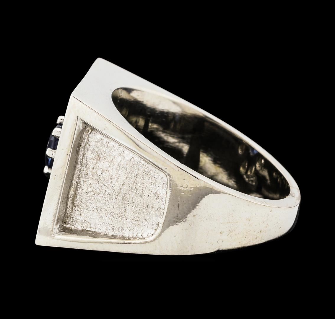 One electronically tested 14KT white gold man's cast fashion ring with a tapered shank with a bright polish and satin finish. The featured man's ring has a center sapphire starburst motif set below a raised square edge and a shank measuring 3.62 millimeters wide. Identified with markings of '14K'. Condition is like new, good workmanship. Containing: One prong set round modified brilliant cut natural blue sapphire, measuring 5.40 - 5.35 x 3.92 mm, (depth est.) approximate weight of 0.91ct., clarity is slightly included, medium dark, very slightly grayish, blue color, (GIA B 6/3), cut is good. Transmitting light somewhat diffusely, transparent to translucent. Colored gemstones are presumed to have been subjected to commonly used enhancement processes. Graded in the setting. Eight prong set round brilliant cut diamonds, measuring 3.10 - 3.00 x 1.83mm (depth est.) approximate total weight of 8 Stones = 0.80ct. Graded in the setting. Clarity VS-2 to SI-1. Color: H - I Cut Good. Total Weight of Colored Stones 0.91ct.. Total Weight of Diamonds 0.80ct.. Total Weight of Ring 20.30gm. GAS Appraised at $5,130.00.