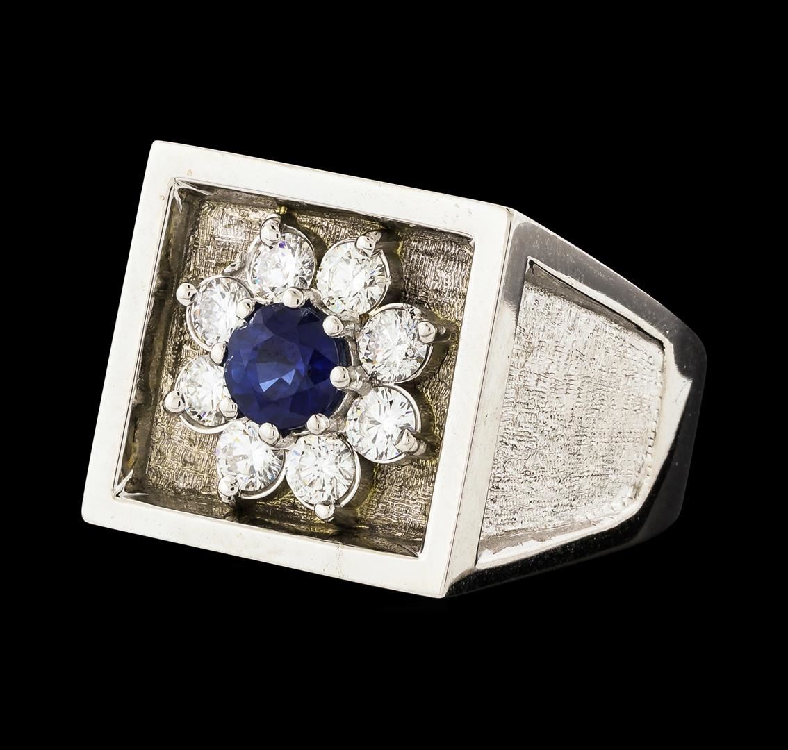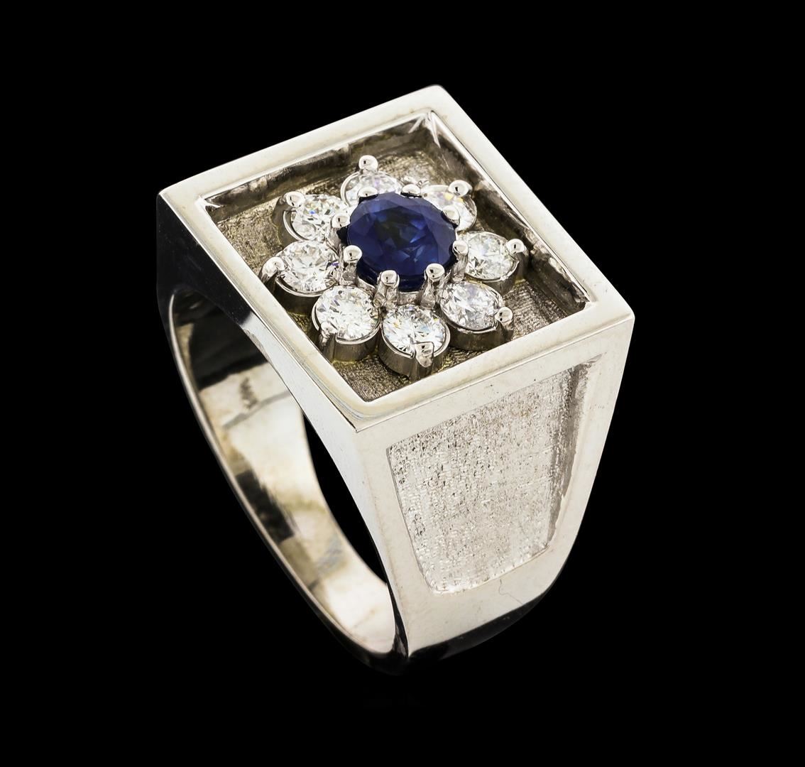 One electronically tested 14KT white gold man's cast fashion ring with a tapered shank with a bright polish and satin finish. The featured man's ring has a center sapphire starburst motif set below a raised square edge and a shank measuring 3.62 millimeters wide. Identified with markings of '14K'. Condition is like new, good workmanship. Containing: One prong set round modified brilliant cut natural blue sapphire, measuring 5.40 - 5.35 x 3.92 mm, (depth est.) approximate weight of 0.91ct., clarity is slightly included, medium dark, very slightly grayish, blue color, (GIA B 6/3), cut is good. Transmitting light somewhat diffusely, transparent to translucent. Colored gemstones are presumed to have been subjected to commonly used enhancement processes. Graded in the setting. Eight prong set round brilliant cut diamonds, measuring 3.10 - 3.00 x 1.83mm (depth est.) approximate total weight of 8 Stones = 0.80ct. Graded in the setting. Clarity VS-2 to SI-1. Color: H - I Cut Good. Total Weight of Colored Stones 0.91ct.. Total Weight of Diamonds 0.80ct.. Total Weight of Ring 20.30gm. GAS Appraised at $5,130.00.