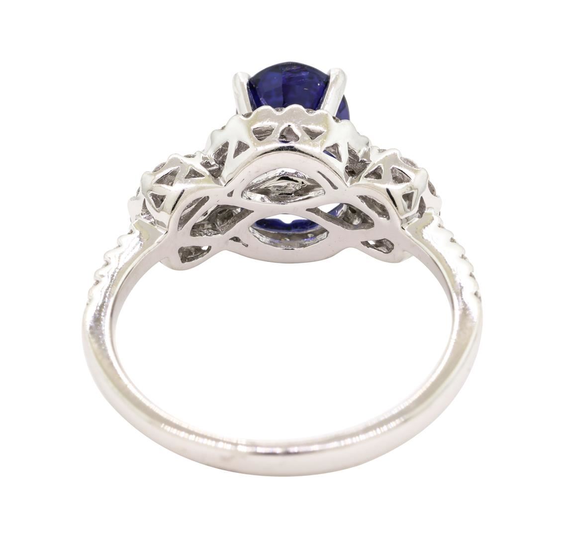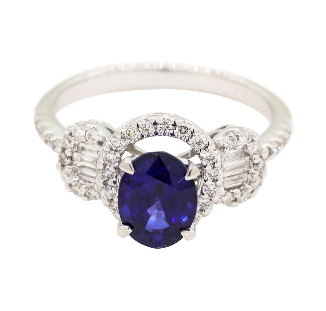 One electronically tested 18KT white gold lady's combination cast & assembled fashion ring with a triple halo with a bright polish finish. The featured lady's ring has a shank measuring 2.00 millimeters wide. Identified with markings of '750'. Condition is new, good workmanship. Containing: One prong set oval modified mixed cut natural blue sapphire, measuring 8.00 x 5.98 x 3.89mm, (depth est.) approximate weight of 1.60ct., clarity is eye clean, medium dark, moderately strong, blue color, (GIA B 6/4), cut is very good. Transmitting light with no distortion, transparent. Colored gemstones are presumed to have been subjected to commonly used enhancement processes. Graded in the setting. Six channel set baguette cut diamonds, measuring from 2.00 x 1.00 x 0.85mm (depth est.) to 2.60 x 1.10 x 0.94mm (depth est.) approximate total weight of 6 Stones = 0.11ct. Graded in the setting. Color F - G Clarity VS-1 to VS-2 Cut Very Good Forty-Four prong set round brilliant cut diamonds, measuring 1.30 - 1.20 x 0.75mm (depth est.) approximate total weight of 44 Stones = 0.31ct. Graded in the setting. Color G - H Clarity VS-2 to SI-1 Cut Very Good. Total Weight of Colored Stones 1.60ct.. Total Weight of Diamonds 0.42ct.. Total Weight of Ring 4.00gm GAS Appraised at $4470.00. GAS Appraised at $4,470.00.