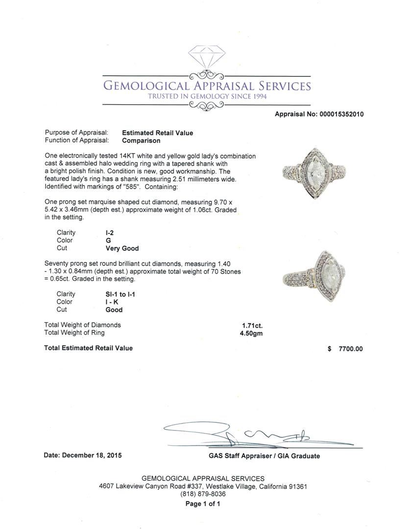 One electronically tested 14KT white and yellow gold lady's combination cast & assembled halo wedding ring with a tapered shank with a bright polish finish. The featured lady's ring has a shank measuring 2.51 millimeters wide. Identified with markings of "585". Condition is new, good workmanship. Containing: One prong set marquise shaped cut diamond, measuring 9.70 x 5.42 x 3.46mm (depth est.) approximate weight of 1.06ct. Graded in the setting. Clarity: I-2. Color: G. Cut Very Good Seventy prong set round brilliant cut diamonds, measuring 1.40 - 1.30 x 0.84mm (depth est.) approximate total weight of 70 Stones = 0.65ct. Graded in the setting. Clarity: SI-1 to I-1. Color: I - K. Cut Good. Total Weight of Diamonds 1.71ct. Total Weight of Ring 4.50gm. GAS Appraised at $7,700.00.