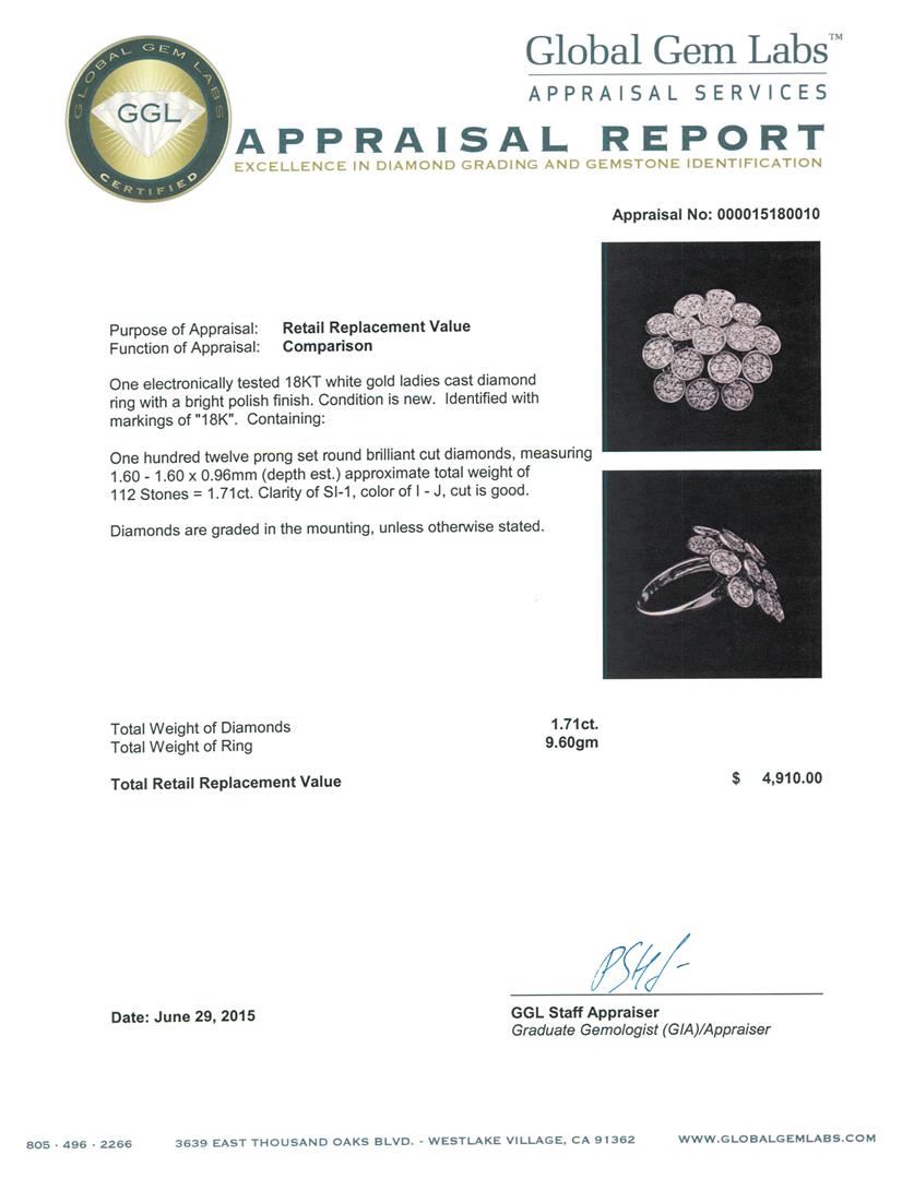 One electronically tested 18KT white gold ladies cast diamond ring with a bright polish finish. Identified with markings of "18K". Condition is new. Containing: One Hundred Twelve prong set round brilliant cut diamonds, measuring 1.60 - 1.60 x 0.96mm (depth est.) approximate total weight of 112 Stones = 1.71ct. Clarity: SI-1. Color: I - J, Cut is Good. Diamonds are graded in the mounting, unless otherwise stated. Total Weight of Diamonds 1.71ct. Total Weight of Ring 9.60 grams. GGL Appraised at $4,910.00.