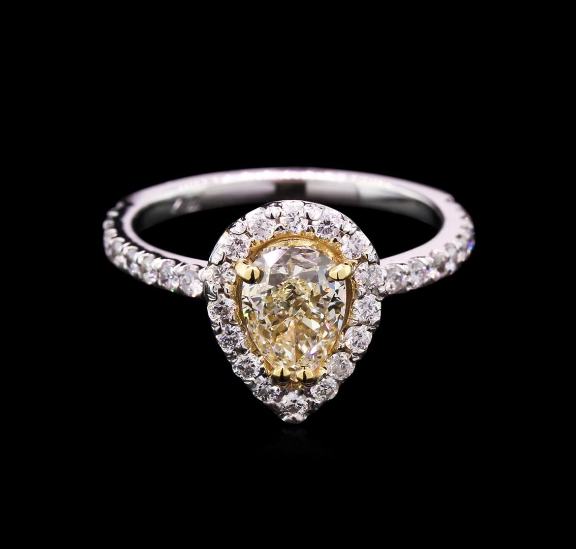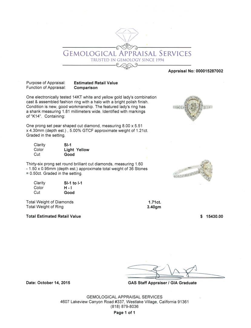 One electronically tested 14KT white and yellow gold lady's combination cast & assembled fashion ring with a halo with a bright polish finish. The featured lady's ring has a shank measuring 1.81 millimeters wide. Identified with markings of "K14". Condition is new, good workmanship. Containing: One prong set pear shaped cut diamond, measuring 8.00 x 5.51 x 4.30mm (depth est.) , 5.00% GTCF approximate weight of 1.21ct. Graded in the setting. Clarity: SI-1 Cut Good Thirty-Six prong set round brilliant cut diamonds, measuring 1.60 - 1.50 x 0.95mm (depth est.) approximate total weight of 36 Stones = 0.50ct. Graded in the setting. Clarity: SI-1 to I-1. Color: H - I. Cut Good. Total Weight of Diamonds 1.71ct. Total Weight of Ring 3.40gm. GAS Appraised at $15,430.00.