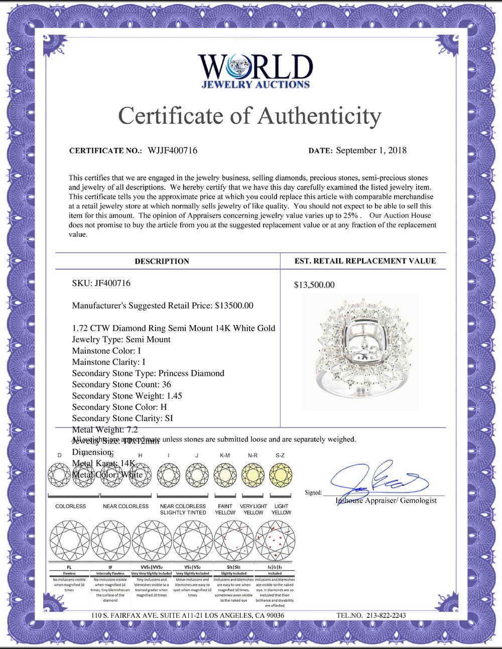 All property is sold “AS IS”, and ALL SALES ARE FINAL. Property is open to thorough public inspection. It is the Bidder’s responsibility to determine condition, age, genuineness, value or any other determinative factor. WJA may attempt to describe the merchandise in advertising and on the Internet but makes no representations. In no event shall WORLD JEWELRY AUCTION be held responsible for having made or implied any warranty of merchantability or fitness for a particular purpose. Bidder shall be the sole judge of value.