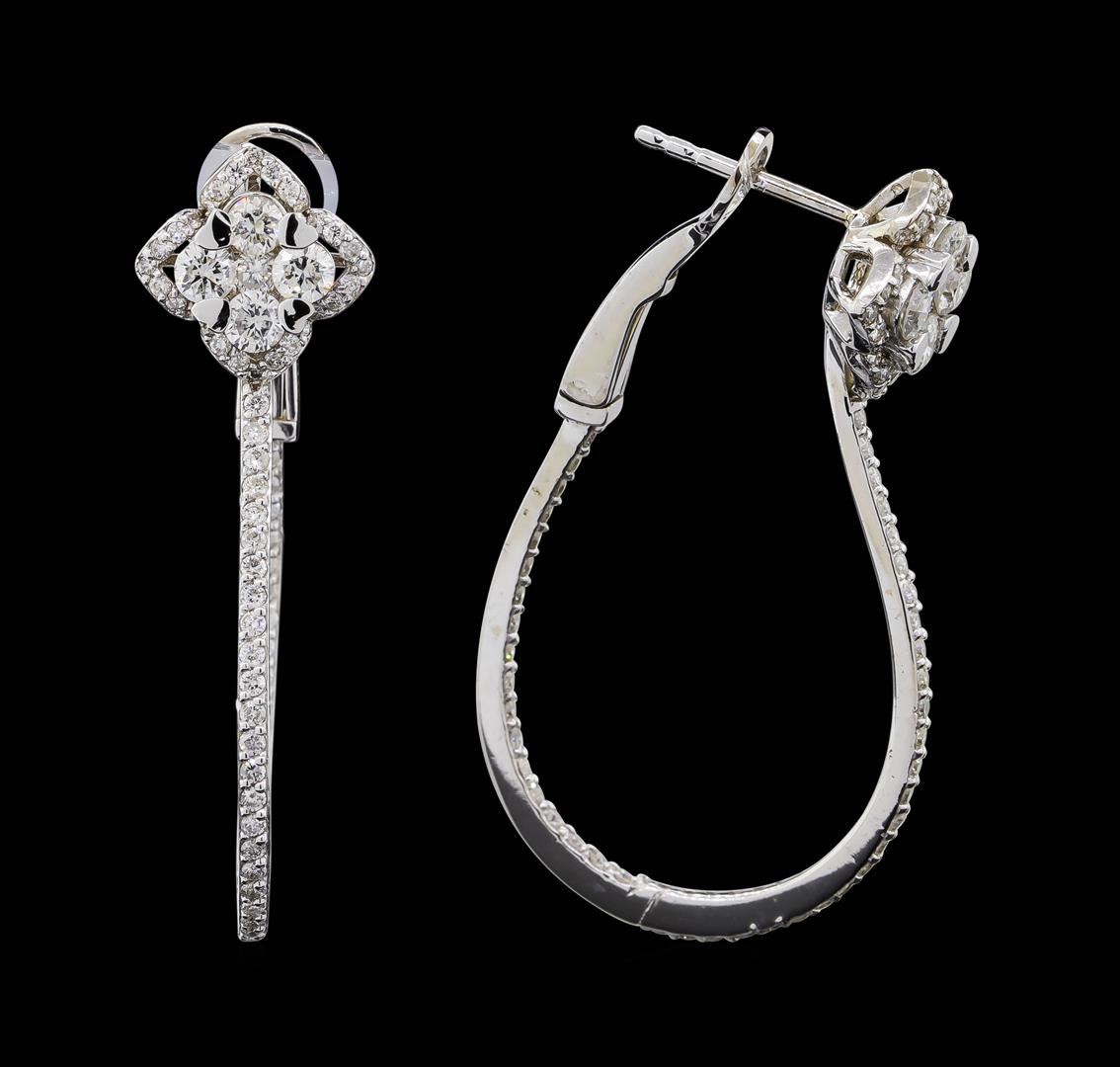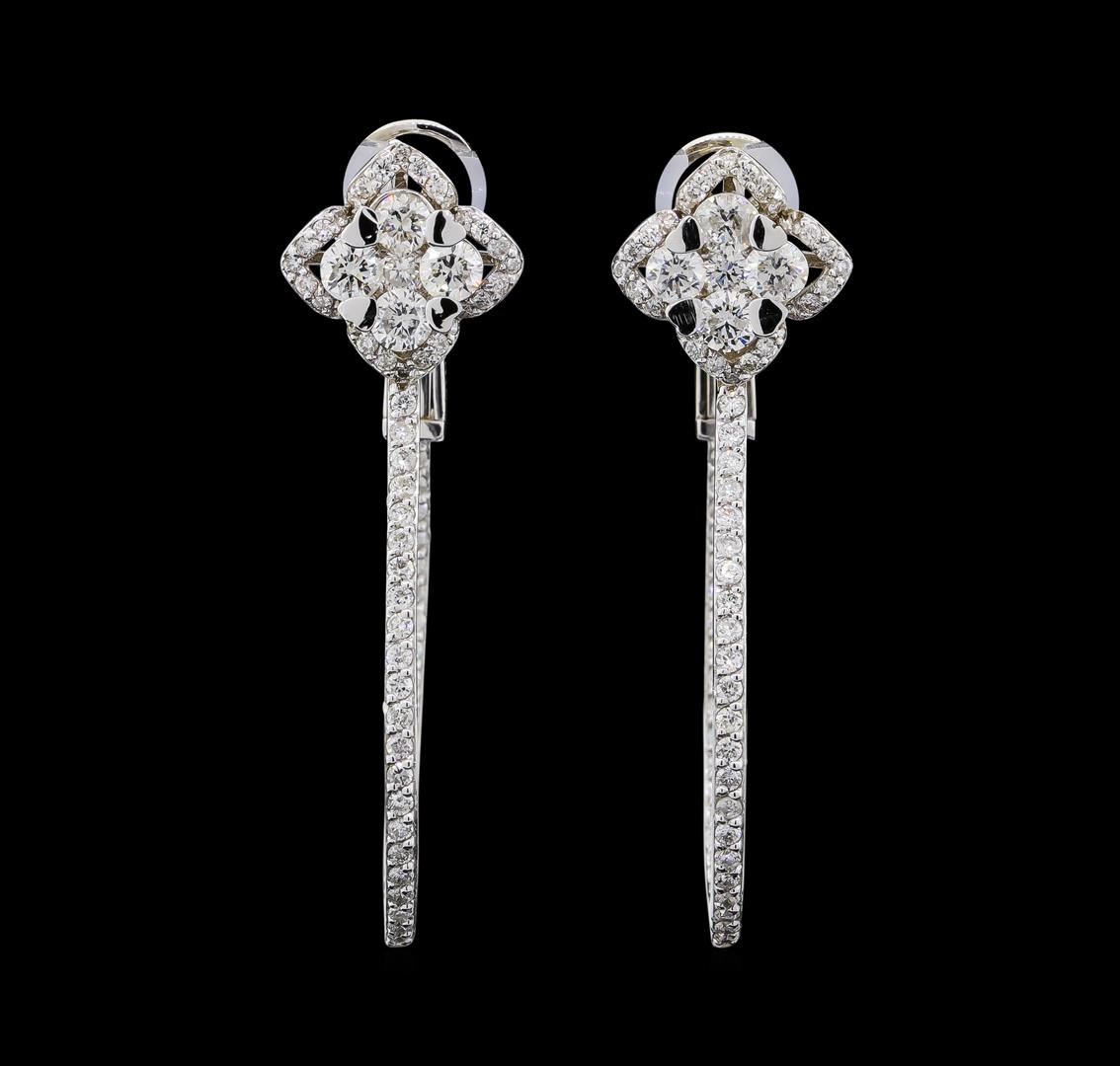 One pair electronically tested 14KT white gold lady's combination cast & assembled inside out hoop earrings with hinged clip backs with a bright polish finish. The featured lady's earring have a drop of approximately 39 millimeters. Identified with markings of 'K14'. Condition is new, good workmanship. Containing: Eight prong set round brilliant cut diamonds, measuring 3.00 - 2.90 x 1.77mm (depth est.) approximate total weight of 8 Stones = 0.74ct. Graded in the setting. Clarity SI-1 to I-1. Color: H - I Cut Good Two prong set round brilliant cut diamonds, measuring 2.40 - 2.35 x 1.45mm (depth est.) approximate total weight of 2 Stones = 0.10ct. Graded in the setting. Clarity SI-1 to SI-2. Color: H - I Cut Good Eighty-Six prong set round brilliant cut diamonds, measuring 1.30 - 1.20 x 0.76mm (depth est.) approximate total weight of 86 Stones = 0.62ct. Graded in the setting. Clarity SI-1 to I-1. Color: H - I Cut Good Fifty-Six prong set round brilliant cut diamonds, measuring 1.10 - 1.05 x 0.67mm (depth est.) approximate total weight of 56 Stones = 0.26ct. Graded in the setting. Clarity SI-1 to SI-2. Color: H - I Cut Good. Total Weight of Diamonds 1.72ct.. Total Weight of Earrings 6.70gm. GAS Appraised at $5,980.00.