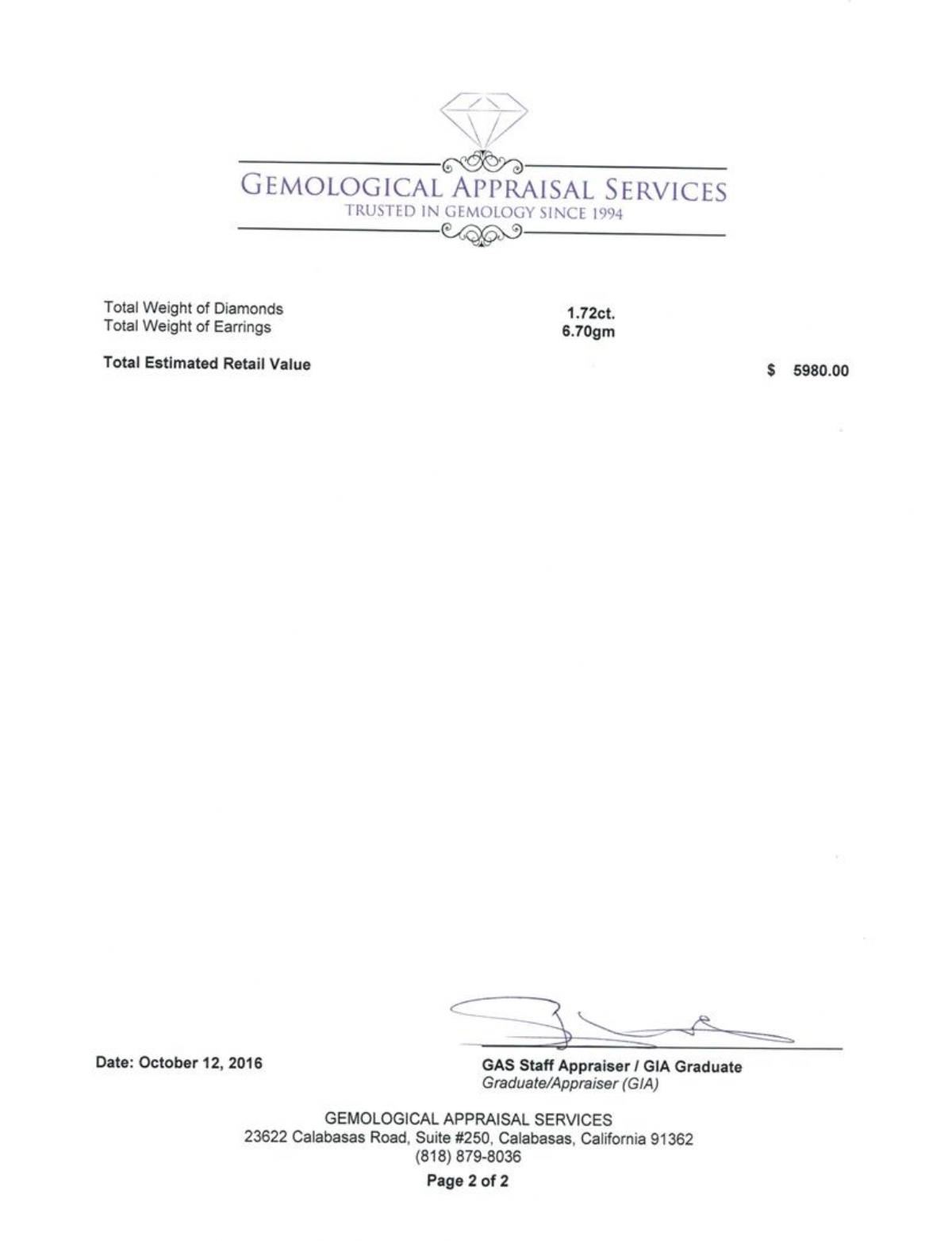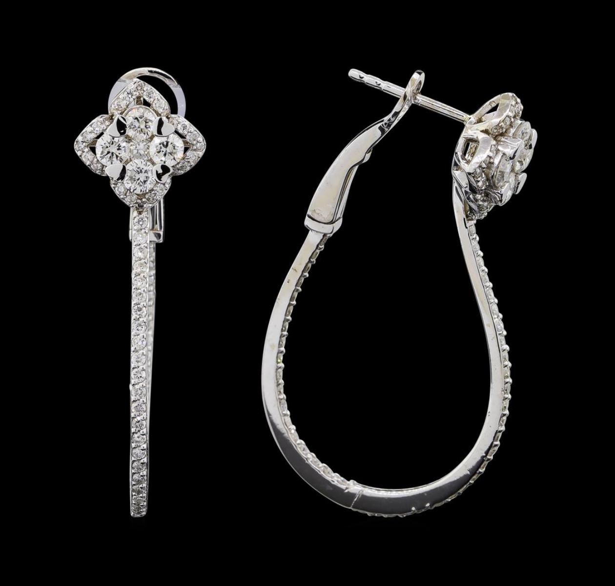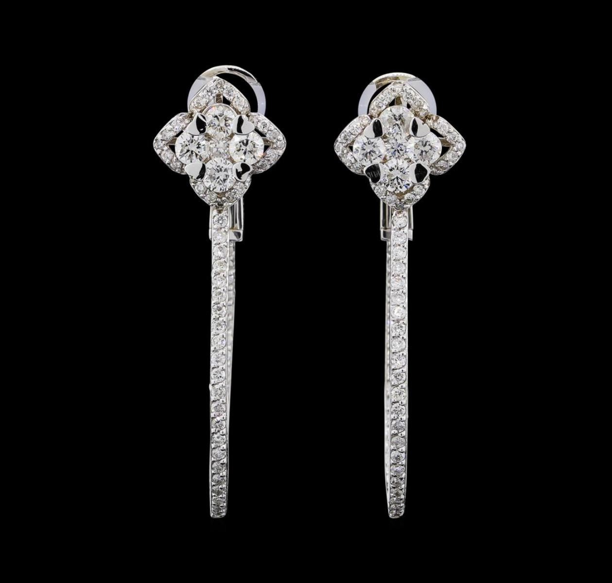 One pair electronically tested 14KT white gold lady's combination cast & assembled inside out hoop earrings with hinged clip backs with a bright polish finish. The featured lady's earring have a drop of approximately 39 millimeters. Identified with markings of 'K14'. Condition is new, good workmanship. Containing: Eight prong set round brilliant cut diamonds, measuring 3.00 - 2.90 x 1.77mm (depth est.) approximate total weight of 8 Stones = 0.74ct. Graded in the setting. Clarity SI-1 to I-1. Color: H - I Cut Good Two prong set round brilliant cut diamonds, measuring 2.40 - 2.35 x 1.45mm (depth est.) approximate total weight of 2 Stones = 0.10 ct. Graded in the setting. Clarity SI-1 to SI-2. Color: H - I Cut Good Eighty-Six prong set round brilliant cut diamonds, measuring 1.30 - 1.20 x 0.76mm (depth est.) approximate total weight of 86 Stones = 0.62ct. Graded in the setting. Clarity SI-1 to I-1. Color: H - I Cut Good Fifty-Six prong set round brilliant cut diamonds, measuring 1.10 - 1.05 x 0.67mm (depth est.) approximate total weight of 56 Stones = 0.26ct. Graded in the setting. Clarity SI-1 to SI-2. Color: H - I Cut Good. Total Weight of Diamonds 1.72ct.. Total Weight of Earrings 6.70gm. GAS Appraised.