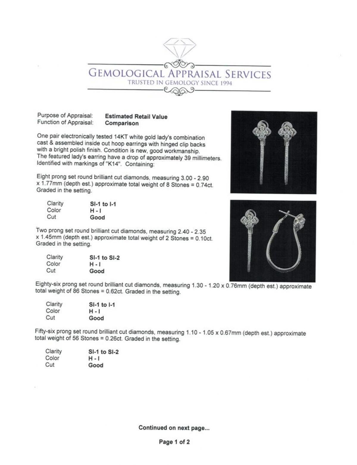 One pair electronically tested 14KT white gold lady's combination cast & assembled inside out hoop earrings with hinged clip backs with a bright polish finish. The featured lady's earring have a drop of approximately 39 millimeters. Identified with markings of 'K14'. Condition is new, good workmanship. Containing: Eight prong set round brilliant cut diamonds, measuring 3.00 - 2.90 x 1.77mm (depth est.) approximate total weight of 8 Stones = 0.74ct. Graded in the setting. Clarity SI-1 to I-1. Color: H - I Cut Good Two prong set round brilliant cut diamonds, measuring 2.40 - 2.35 x 1.45mm (depth est.) approximate total weight of 2 Stones = 0.10 ct. Graded in the setting. Clarity SI-1 to SI-2. Color: H - I Cut Good Eighty-Six prong set round brilliant cut diamonds, measuring 1.30 - 1.20 x 0.76mm (depth est.) approximate total weight of 86 Stones = 0.62ct. Graded in the setting. Clarity SI-1 to I-1. Color: H - I Cut Good Fifty-Six prong set round brilliant cut diamonds, measuring 1.10 - 1.05 x 0.67mm (depth est.) approximate total weight of 56 Stones = 0.26ct. Graded in the setting. Clarity SI-1 to SI-2. Color: H - I Cut Good. Total Weight of Diamonds 1.72ct.. Total Weight of Earrings 6.70gm. GAS Appraised.