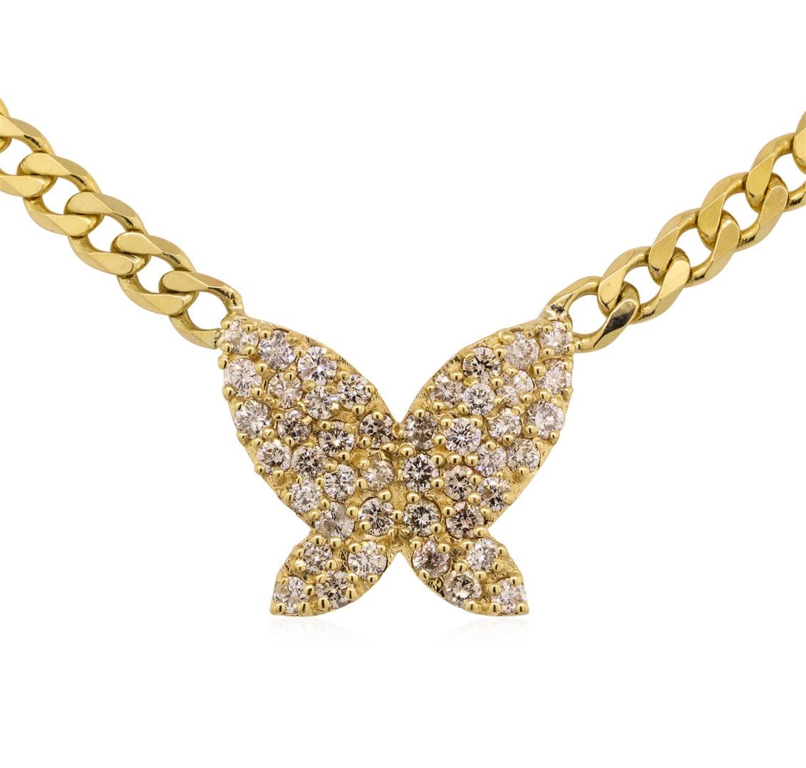 One electronically tested 14KT yellow gold lady's combination cast & assembled fashion necklace with a lobster claw clasp with a bright polish finish. The featured lady's necklace has three separate butterfly motifs and a 3.80 millimeter wide flat cable link chain measuring approximately sixteen inches in length. Identified with markings of '14K'. Condition is new, good workmanship. Containing: Forty-Four prong set round brilliant cut diamonds, measuring 1.90 - 1.70 x 1.12mm (depth est.) approximate total weight of 44 Stones = 1.00ct. Graded in the setting. Color H - I Clarity SI-1 to SI-2 Cut Good Ninety-Two prong set round brilliant cut diamonds, measuring 1.30 - 1.25 x 0.79mm (depth est.) approximate total weight of 92 Stones = 0.72ct. Graded in the setting. Color H - I Clarity SI-1 to SI-2 Cut Good. Total Weight of Diamonds 1.72ct.. Total Weight of Necklace 15.90gm GAS Appraised at $6675.00. GAS Appraised.