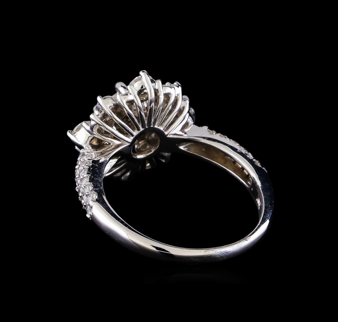 One electronically tested 14KT white gold lady's combination cast & assembled fashion ring with a halo with a bright polish finish. The featured lady's ring has a shank measuring 1.91 millimeters in width. Identified with markings of "14K". Condition is new, good workmanship. Containing: One prong set round brilliant cut diamond, measuring 5.12 - 5.10 x 3.17mm (depth est.) , 5.00.%. GTCF approximate weight of 0.55ct. Graded in the setting. Clarity: I-1. Color: Very Good Four prong set round brilliant cut diamonds, measuring 3.20 - 3.10 x 1.89mm (depth est.) approximate total weight of 4 Stones = 0.42ct. Graded in the setting. Clarity: VS-2 to SI-1. Color: H - I. Cut Very Good Twenty prong set round brilliant cut diamonds, measuring 2.00 - 1.60 x 1.08mm (depth est.) approximate total weight of 20 Stones = 0.43ct. Graded in the setting. Clarity: SI-1 to SI-2. Color: H - I. Cut Good Thirty-Eight prong set round brilliant cut diamonds, measuring 1.40 - 1.30 x 0.81mm (depth est.) approximate total weight of 38 Stones = 0.32ct. Graded in the setting. Clarity: SI-1 to I-1. Color: H - I. Cut Good. Total Weight of Diamonds 1.72ct. Total Weight of Ring 4.80gm. GAS Appraised at $5,930.00.
