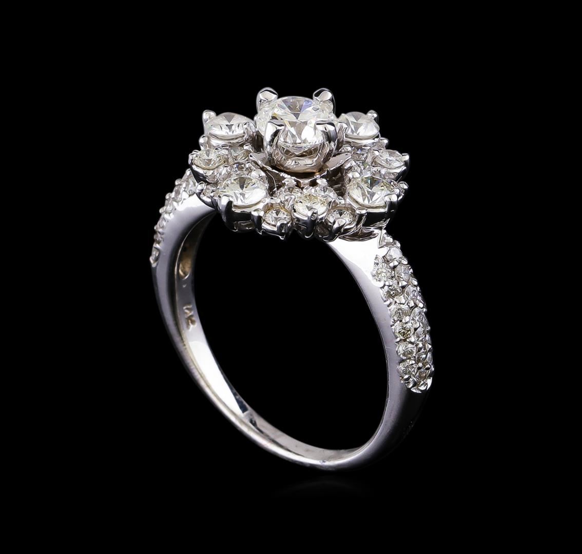 One electronically tested 14KT white gold lady's combination cast & assembled fashion ring with a halo with a bright polish finish. The featured lady's ring has a shank measuring 1.91 millimeters in width. Identified with markings of "14K". Condition is new, good workmanship. Containing: One prong set round brilliant cut diamond, measuring 5.12 - 5.10 x 3.17mm (depth est.) , 5.00.%. GTCF approximate weight of 0.55ct. Graded in the setting. Clarity: I-1. Color: Very Good Four prong set round brilliant cut diamonds, measuring 3.20 - 3.10 x 1.89mm (depth est.) approximate total weight of 4 Stones = 0.42ct. Graded in the setting. Clarity: VS-2 to SI-1. Color: H - I. Cut Very Good Twenty prong set round brilliant cut diamonds, measuring 2.00 - 1.60 x 1.08mm (depth est.) approximate total weight of 20 Stones = 0.43ct. Graded in the setting. Clarity: SI-1 to SI-2. Color: H - I. Cut Good Thirty-Eight prong set round brilliant cut diamonds, measuring 1.40 - 1.30 x 0.81mm (depth est.) approximate total weight of 38 Stones = 0.32ct. Graded in the setting. Clarity: SI-1 to I-1. Color: H - I. Cut Good. Total Weight of Diamonds 1.72ct. Total Weight of Ring 4.80gm. GAS Appraised at $5,930.00.
