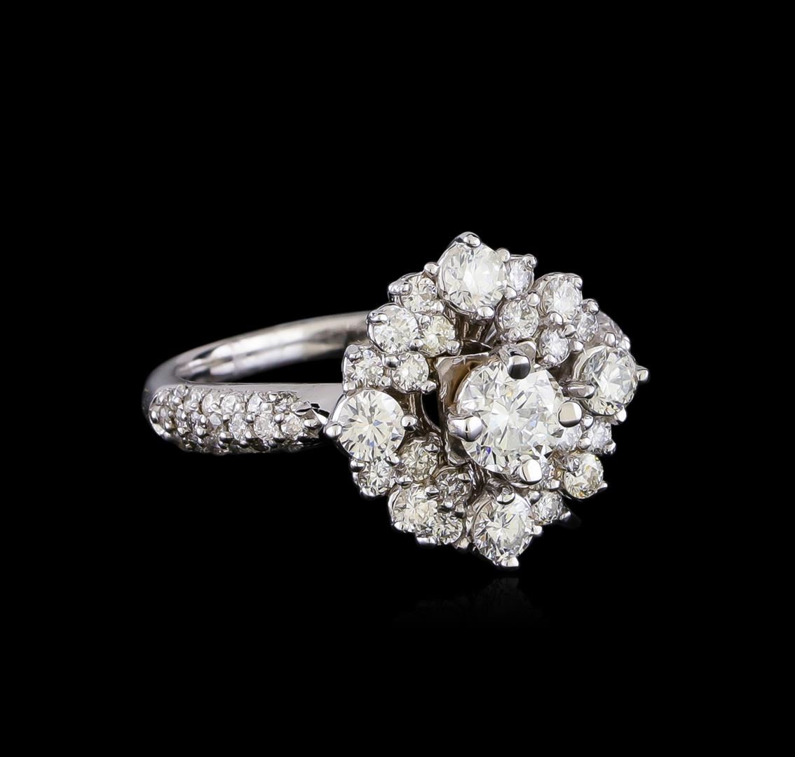 One electronically tested 14KT white gold lady's combination cast & assembled fashion ring with a halo with a bright polish finish. The featured lady's ring has a shank measuring 1.91 millimeters in width. Identified with markings of "14K". Condition is new, good workmanship. Containing: One prong set round brilliant cut diamond, measuring 5.12 - 5.10 x 3.17mm (depth est.) , 5.00.%. GTCF approximate weight of 0.55ct. Graded in the setting. Clarity: I-1. Color: Very Good Four prong set round brilliant cut diamonds, measuring 3.20 - 3.10 x 1.89mm (depth est.) approximate total weight of 4 Stones = 0.42ct. Graded in the setting. Clarity: VS-2 to SI-1. Color: H - I. Cut Very Good Twenty prong set round brilliant cut diamonds, measuring 2.00 - 1.60 x 1.08mm (depth est.) approximate total weight of 20 Stones = 0.43ct. Graded in the setting. Clarity: SI-1 to SI-2. Color: H - I. Cut Good Thirty-Eight prong set round brilliant cut diamonds, measuring 1.40 - 1.30 x 0.81mm (depth est.) approximate total weight of 38 Stones = 0.32ct. Graded in the setting. Clarity: SI-1 to I-1. Color: H - I. Cut Good. Total Weight of Diamonds 1.72ct. Total Weight of Ring 4.80gm. GAS Appraised at $5,930.00.