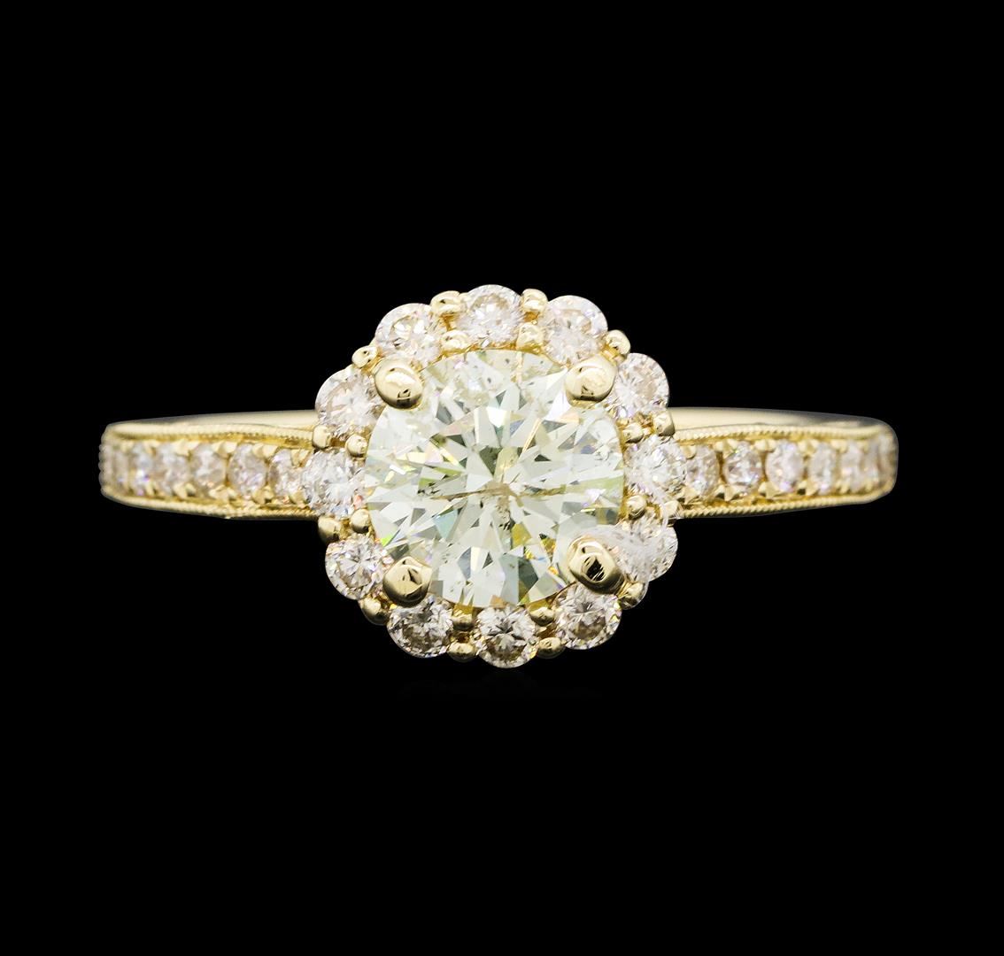 One electronically tested 14KT yellow gold lady's cast vintage style wedding ring with a cathedral shank with a basket halo with a bright polish with milgrain detailing finish. The featured lady's ring has a shank measuring 1.91 millimeters wide. Identified with markings of '14K'. Condition is new, good workmanship. Containing: One prong set round brilliant cut diamond, measuring 6.59 - 6.56 x 3.95mm (depth est.) approximate weight of 1.06ct. Graded in the setting. Color L - M Clarity I-1 Cut Good Twelve prong set round brilliant cut diamonds, measuring 2.00 - 1.90 x 1.19mm (depth est.) approximate total weight of 12 Stones = 0.33ct. Graded in the setting. Color I - J Clarity SI-1 to SI-2 Cut Good Thirty prong set round brilliant cut diamonds, measuring 1.60 - 1.10 x 0.84mm (depth est.) approximate total weight of 30 Stones = 0.31ct. Graded in the setting. Color H - I Clarity SI-1 to I-1 Cut Good Eight prong set round brilliant cut diamonds, measuring 0.90 - 0.80 x 0.53mm (depth est.) approximate total weight of 8 Stones = 0.02ct. Graded in the setting. Color H - I Clarity SI-1 to SI-2 Cut Good. Total Weight of Diamonds 1.72ct.. Total Weight of Ring 3.70gm GAS Appraised at $10,905.00.