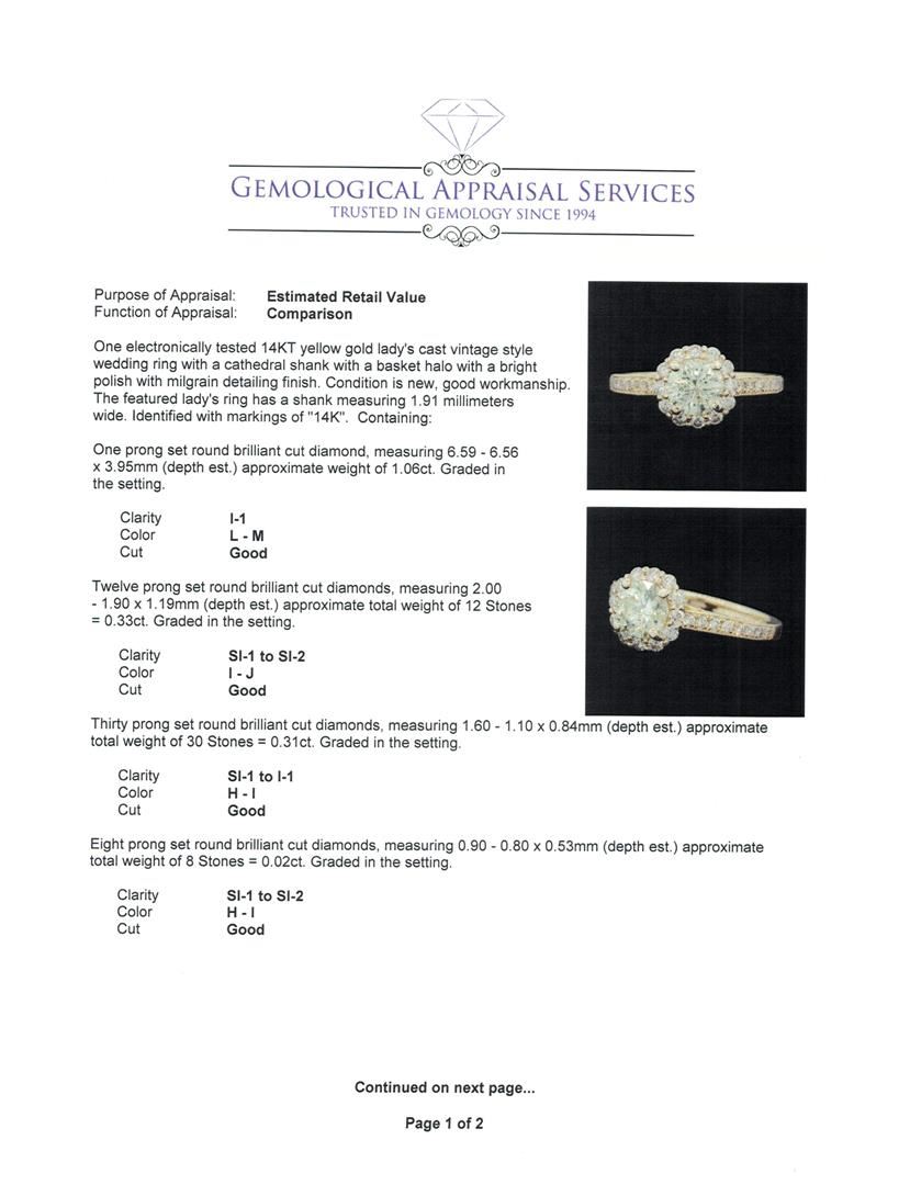 One electronically tested 14KT yellow gold lady's cast vintage style wedding ring with a cathedral shank with a basket halo with a bright polish with milgrain detailing finish. The featured lady's ring has a shank measuring 1.91 millimeters wide. Identified with markings of '14K'. Condition is new, good workmanship. Containing: One prong set round brilliant cut diamond, measuring 6.59 - 6.56 x 3.95mm (depth est.) approximate weight of 1.06ct. Graded in the setting. Color L - M Clarity I-1 Cut Good Twelve prong set round brilliant cut diamonds, measuring 2.00 - 1.90 x 1.19mm (depth est.) approximate total weight of 12 Stones = 0.33ct. Graded in the setting. Color I - J Clarity SI-1 to SI-2 Cut Good Thirty prong set round brilliant cut diamonds, measuring 1.60 - 1.10 x 0.84mm (depth est.) approximate total weight of 30 Stones = 0.31ct. Graded in the setting. Color H - I Clarity SI-1 to I-1 Cut Good Eight prong set round brilliant cut diamonds, measuring 0.90 - 0.80 x 0.53mm (depth est.) approximate total weight of 8 Stones = 0.02ct. Graded in the setting. Color H - I Clarity SI-1 to SI-2 Cut Good. Total Weight of Diamonds 1.72ct.. Total Weight of Ring 3.70gm GAS Appraised at $10,905.00.