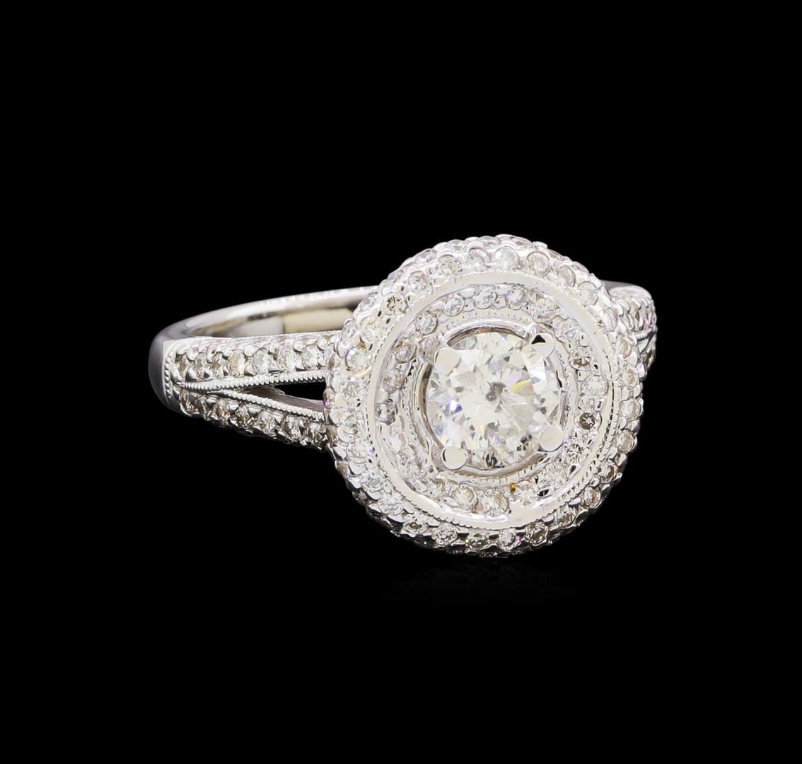One electronically tested 18KT white gold lady's combination cast & assembled split shank wedding ring with a double halo with a bright polish with milgrain detailing finish. The featured lady's ring has a shank measuring 2.0 millimeters in width. Identified with markings of "18K". Condition is new, good workmanship. Containing: One prong set round brilliant cut diamond, measuring 5.50 - 5.43 x 3.72mm (depth est.) approximate weight of 0.70ct. Graded in the setting. Clarity: I-1. Color: H - I. Cut Very Good Six bezel set round brilliant cut diamonds, measuring 1.60 - 1.50 x 0.93mm (depth est.) approximate total weight of 6 Stones = 0.08ct. Graded in the setting. Clarity: SI-1 to SI-2. Color: G - Very Good One Hundred Eighty-Two prong set round brilliant cut diamonds, measuring 1.15 - 1.00 x 0.65mm (depth est.) approximate total weight of 182 Stones = 0.94ct. Graded in the setting. Clarity: SI-1 to SI-2. Color: G - I. Cut Good. Total Weight of Diamonds 1.72ct. Total Weight of Wedding Ring 7.50gm. GAS Appraised at $8,620.00.