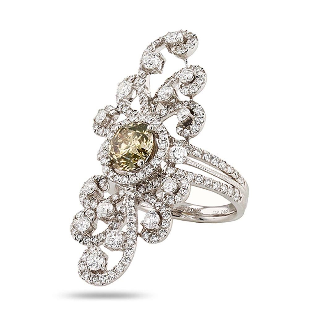 Platinum Diamond Ring One polished, stamped, and tested platinum ring with a bright finish. The ring is mounted with 1 genuine fancy color diamond center stone weighing approximately 1.72 carat, and 190 genuine round diamonds weighing approximately 2.24 carats. This item weighs 14.6 grams, condition is new, excellent workmanship. MAIN GEMSTONE Identity: Natural Diamond Shape: Round Cutting Style: Brilliant Cut Average Diameter: 7.4 mm Depth: 4.8 mm Weight: 1.72 carat Color Grade: Fancy Brownish Orange Clarity Grade: I1 Polish: Excellent Symmetry: Very Good Refractive Index: 2.417 Hardness: 10 ADJACENT GEMSTONES ON RING Identity: Natural Diamond Shape: Round Cutting Style: Brilliant Cut Quantity: 190 Diamonds Measurements: 1.2 - 2.5mm Total Weight: 2.24 carats Color Grade: F - G Clarity Grade: SI1 to SI2 Refractive Index: 2.418 Hardness: 10 CENTER DIAMOND WEIGHT: 1.72ct TOTAL DIAMOND WEIGHT: 3.96ctw WEIGHT OF ITEM: 14.6 grams METAL: Platinum