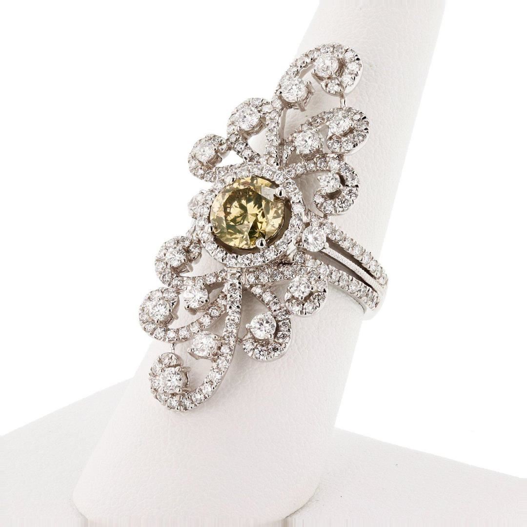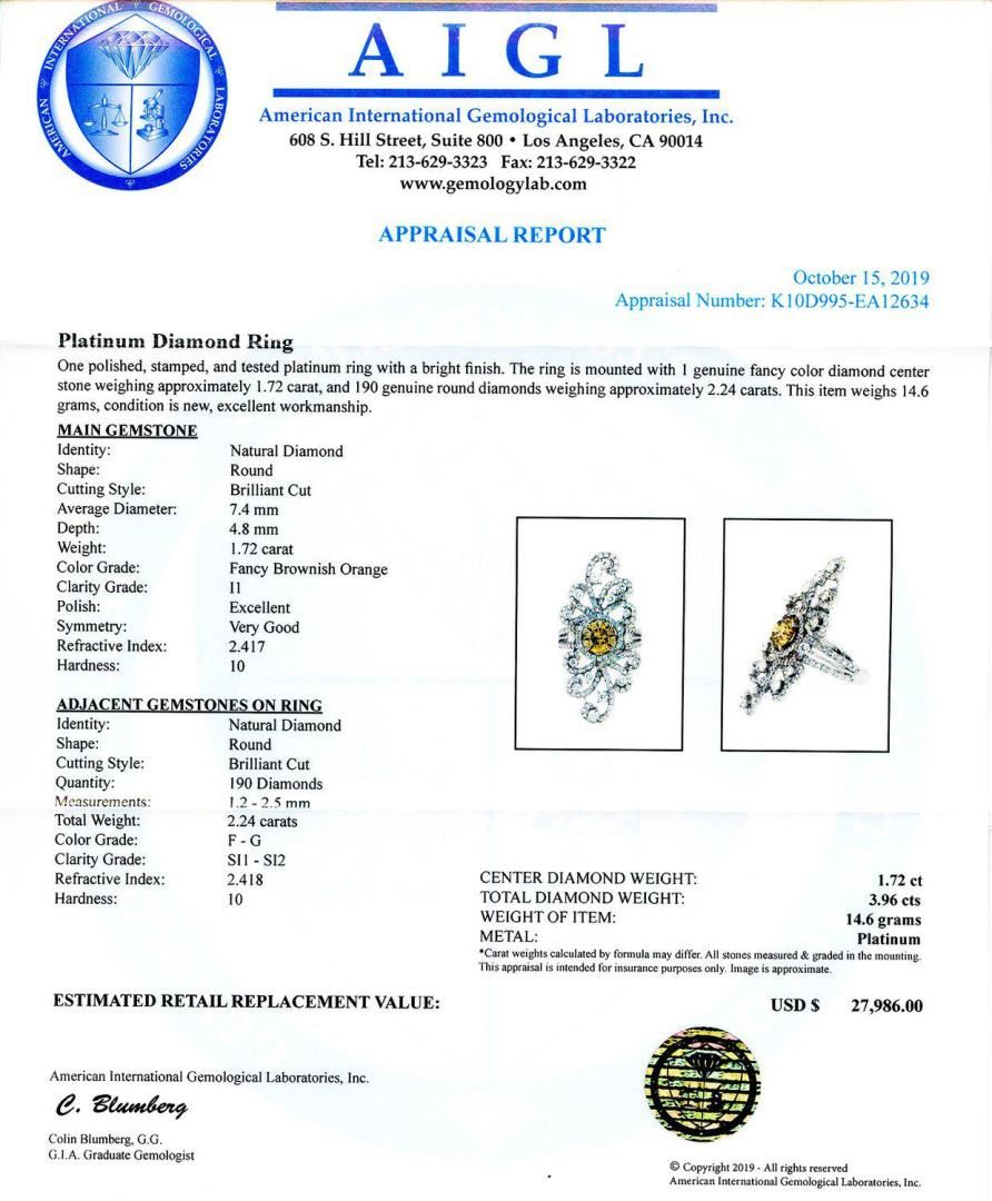 Platinum Diamond Ring One polished, stamped, and tested platinum ring with a bright finish. The ring is mounted with 1 genuine fancy color diamond center stone weighing approximately 1.72 carat, and 190 genuine round diamonds weighing approximately 2.24 carats. This item weighs 14.6 grams, condition is new, excellent workmanship. MAIN GEMSTONE Identity: Natural Diamond Shape: Round Cutting Style: Brilliant Cut Average Diameter: 7.4 mm Depth: 4.8 mm Weight: 1.72 carat Color Grade: Fancy Brownish Orange Clarity Grade: I1 Polish: Excellent Symmetry: Very Good Refractive Index: 2.417 Hardness: 10 ADJACENT GEMSTONES ON RING Identity: Natural Diamond Shape: Round Cutting Style: Brilliant Cut Quantity: 190 Diamonds Measurements: 1.2 - 2.5mm Total Weight: 2.24 carats Color Grade: F - G Clarity Grade: SI1 to SI2 Refractive Index: 2.418 Hardness: 10 CENTER DIAMOND WEIGHT: 1.72ct TOTAL DIAMOND WEIGHT: 3.96ctw WEIGHT OF ITEM: 14.6 grams METAL: Platinum Size: 6 3/4
