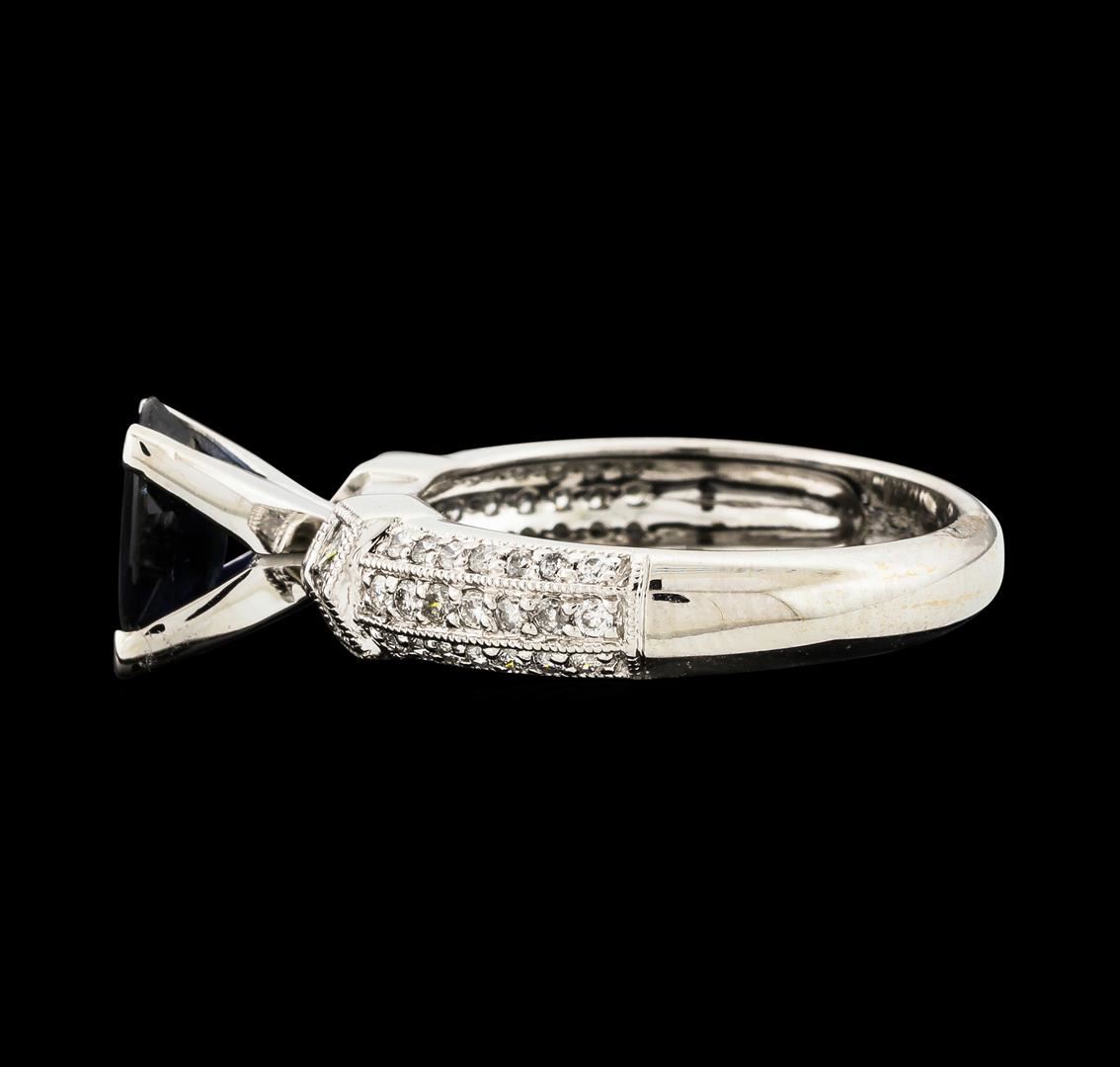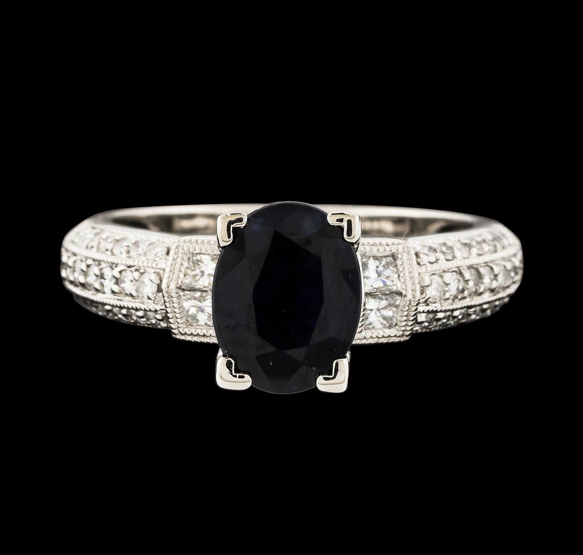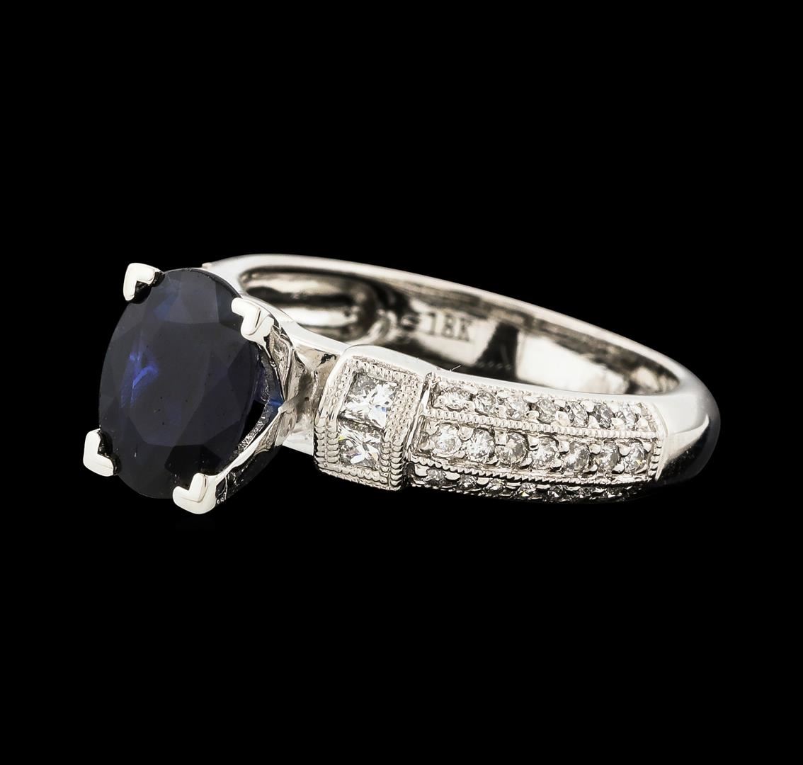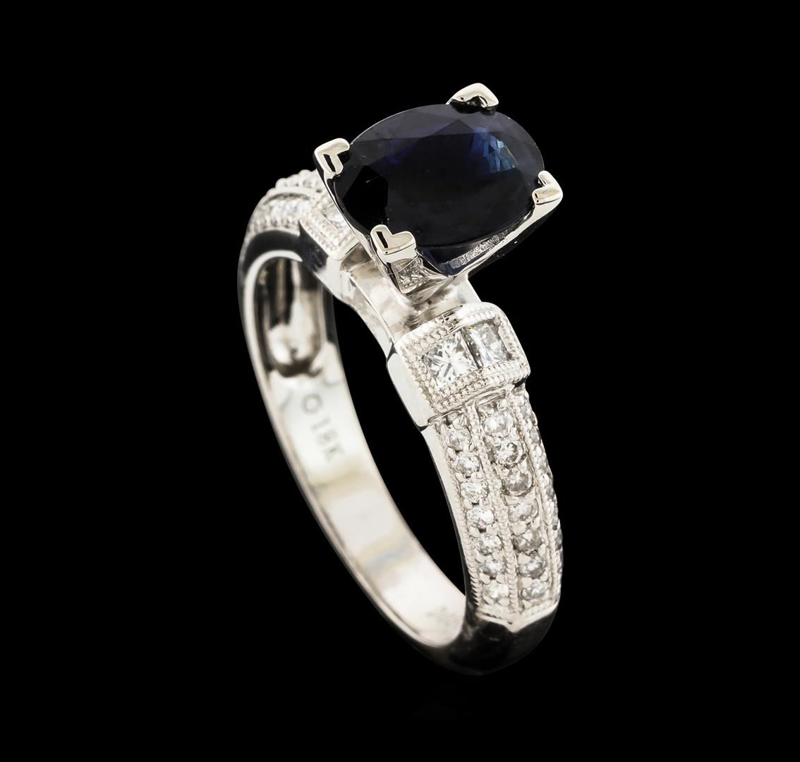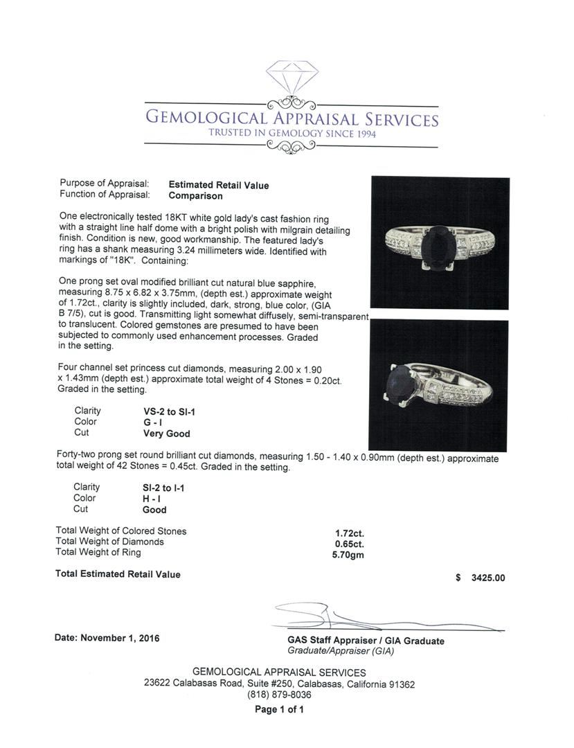 One electronically tested 18KT white gold lady's cast fashion ring with a straight line half dome with a bright polish with milgrain detailing finish. The featured lady's ring has a shank measuring 3.24 millimeters wide. Identified with markings of '18K'. Condition is new, good workmanship. Containing: One prong set oval modified brilliant cut natural blue sapphire, measuring 8.75 x 6.82 x 3.75mm, (depth est.) approximate weight of 1.72ct., clarity is slightly included, dark, strong, blue color, (GIA B 7/5), cut is good. Transmitting light somewhat diffusely, semi-transparent to translucent. Colored gemstones are presumed to have been subjected to commonly used enhancement processes. Graded in the setting. Four channel set princess cut diamonds, measuring 2.00 x 1.90 x 1.43mm (depth est.) approximate total weight of 4 Stones = 0.20ct. Graded in the setting. Clarity VS-2 to SI-1. Color: G - I Cut Very Good Forty-Two prong set round brilliant cut diamonds, measuring 1.50 - 1.40 x 0.90mm (depth est.) approximate total weight of 42 Stones = 0.45ct. Graded in the setting. Clarity SI-2 to I-1. Color: H - I Cut Good. Total Weight of Colored Stones 1.72ct.. Total Weight of Diamonds 0.65ct.. Total Weight of Ring 5.70gm. GAS Appraised at $3,425.00.
