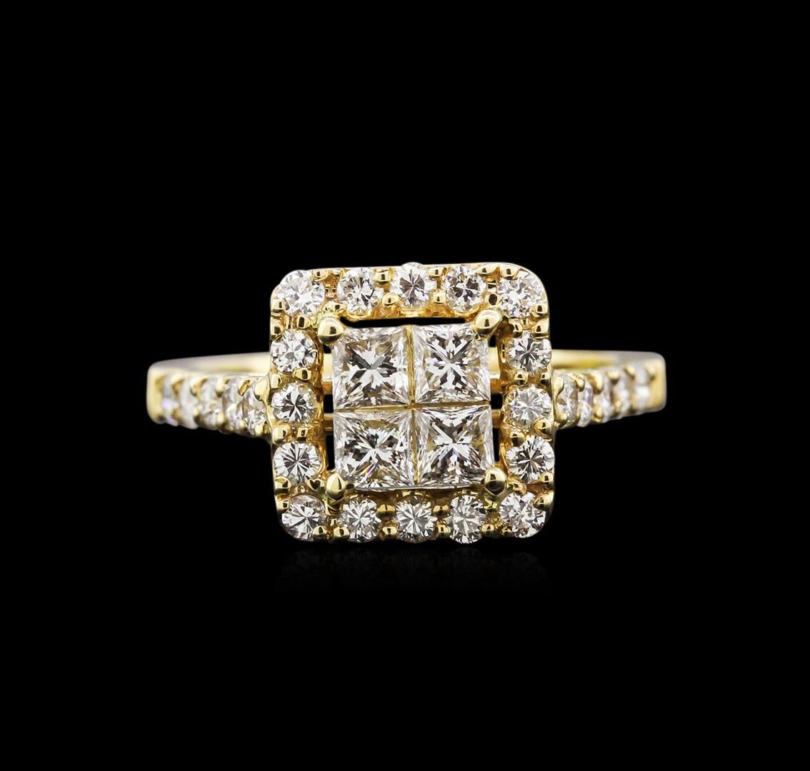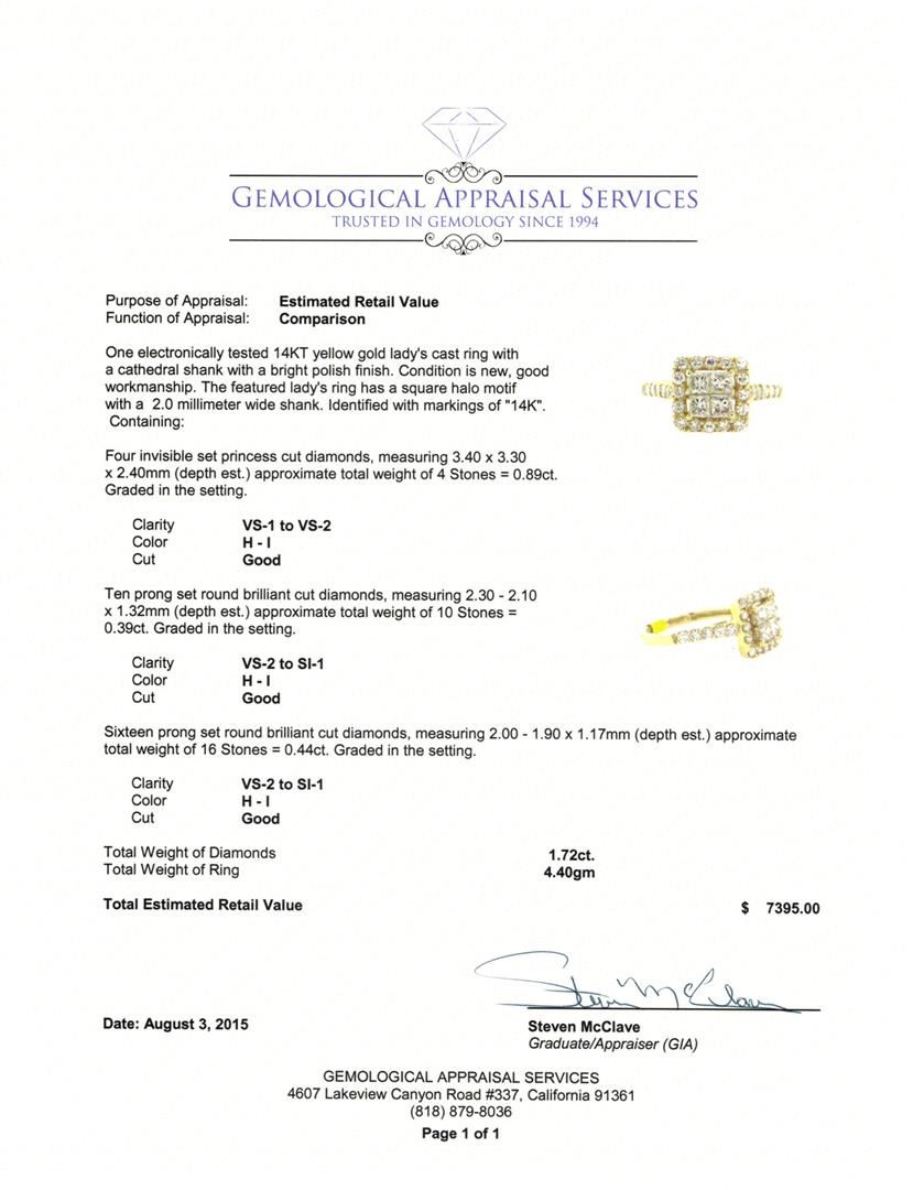 One electronically tested 14KT yellow gold lady's cast ring with a cathedral shank with a bright polish finish. The featured lady's ring has a square halo motif with a 2.0 millimeter wide shank. Identified with markings of "14K". Condition is new, good workmanship. Containing: Four invisible set princess cut diamonds, measuring 3.40 x 3.30 x 2.40mm (depth est.) approximate total weight of 4 Stones = 0.89ct. Graded in the setting. Clarity VS-1 to VS-2 Color H - I. Cut Good Ten prong set round brilliant cut diamonds, measuring 2.30 - 2.10 x 1.32mm (depth est.) approximate total weight of 10 Stones = 0.39ct. Graded in the setting. Clarity VS-2 to SI-1 Color H - I. Cut Good Sixteen prong set round brilliant cut diamonds, measuring 2.00 - 1.90 x 1.17mm (depth est.) approximate total weight of 16 Stones = 0.44ct. Graded in the setting. Clarity VS-2 to SI-1 Color H - I. Cut Good Total Weight of Diamonds 1.72ct. Total Weight of Ring 4.40gm GAS Appraised at $7,395.00.