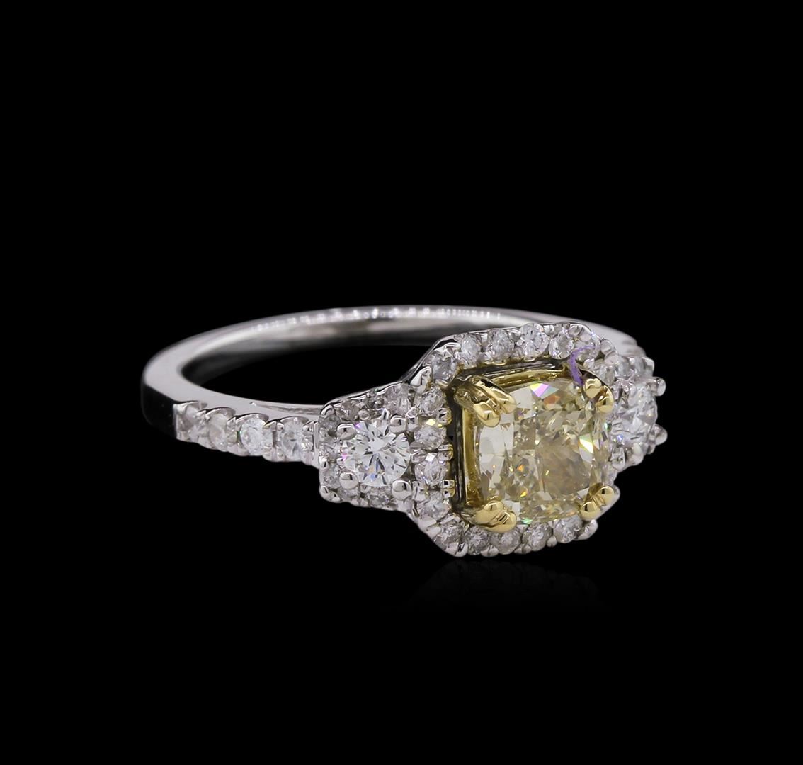 One electronically tested 14KT white and yellow gold lady's combination cast & assembled wedding ring with a cathedral shank with a bright polish finish. The featured lady's ring has a shank measuring 1.58 millimeters wide. Identified with markings of "14K". Condition is new, good workmanship. Containing: One prong set cushion cut diamond, measuring 5.77 x 5.67 x 3.70mm (depth est.) , 5.00.%. GTCF approximate weight of 1.12ct. Graded in the setting. Clarity: SI-2 Cut Very Good Two prong set round brilliant cut diamonds, measuring 2.90 - 2.80 x 1.80mm (depth est.) approximate total weight of 2 Stones = 0.18ct. Graded in the setting. Clarity: SI-1. Color: G - Very Good Eight prong set round brilliant cut diamonds, measuring 1.70 - 1.60 x 1.07mm (depth est.) approximate total weight of 8 Stones = 0.15ct. Graded in the setting. Clarity: SI-2 to I-1. Color: G - Good Twenty prong set round brilliant cut diamonds, measuring 1.40 - 1.35 x 0.86mm (depth est.) approximate total weight of 20 Stones = 0.20ct. Graded in the setting. Clarity: SI-2 to I-1. Color: H - I. Cut Good Ten prong set round brilliant cut diamonds, measuring 1.20 - 1.15 x 0.77mm (depth est.) approximate total weight of 10 Stones = 0.07ct. Graded in the setting. Clarity: SI-2 to I-1. Color: H - I. Cut Good. Total Weight of Diamonds 1.72ct. Total Weight of Ring 4.60gm. GAS Appraised at $11,075.00.