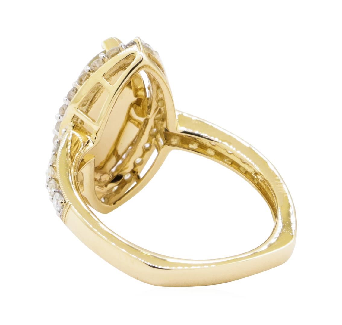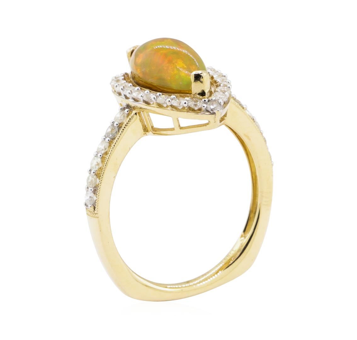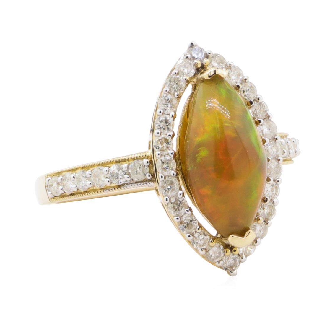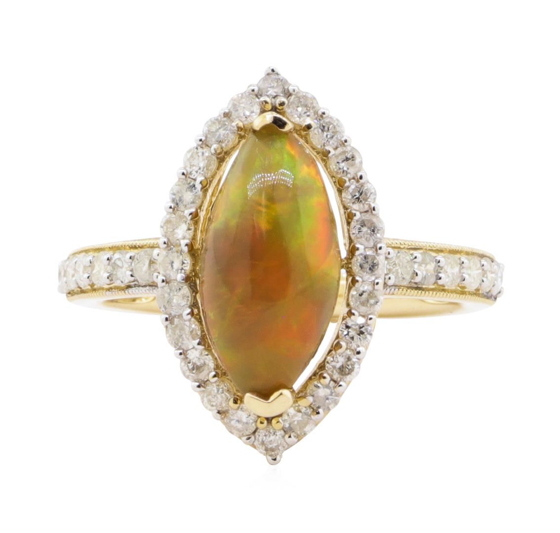 One ladies 14k yellow gold Diamond Ring weighing approx. 4.60 grams. Containing: One Marquise Cabochon Opal weighing approx. 1.73 carat and 36 Round Brilliant cut Diamonds total weight approx. 0.68 carat Gem Type: Opal Shape/cut: Marquise Cabochon Carat weight: Approx. 1.73 carat Measurements: Approx. 14.00 x 6.80 mm Setting: Bezel set Gem Type: Diamond Shape/cut: Round Brilliant cut Carat Weight:: Total approx. 0.68 carat Color: H-J Clarity: I1 - I2 Metal Content: 14k Yellow Gold Setting: Prong set ESTIMATED RETAIL REPLACEMENT VALUE: $3, 399.00 US