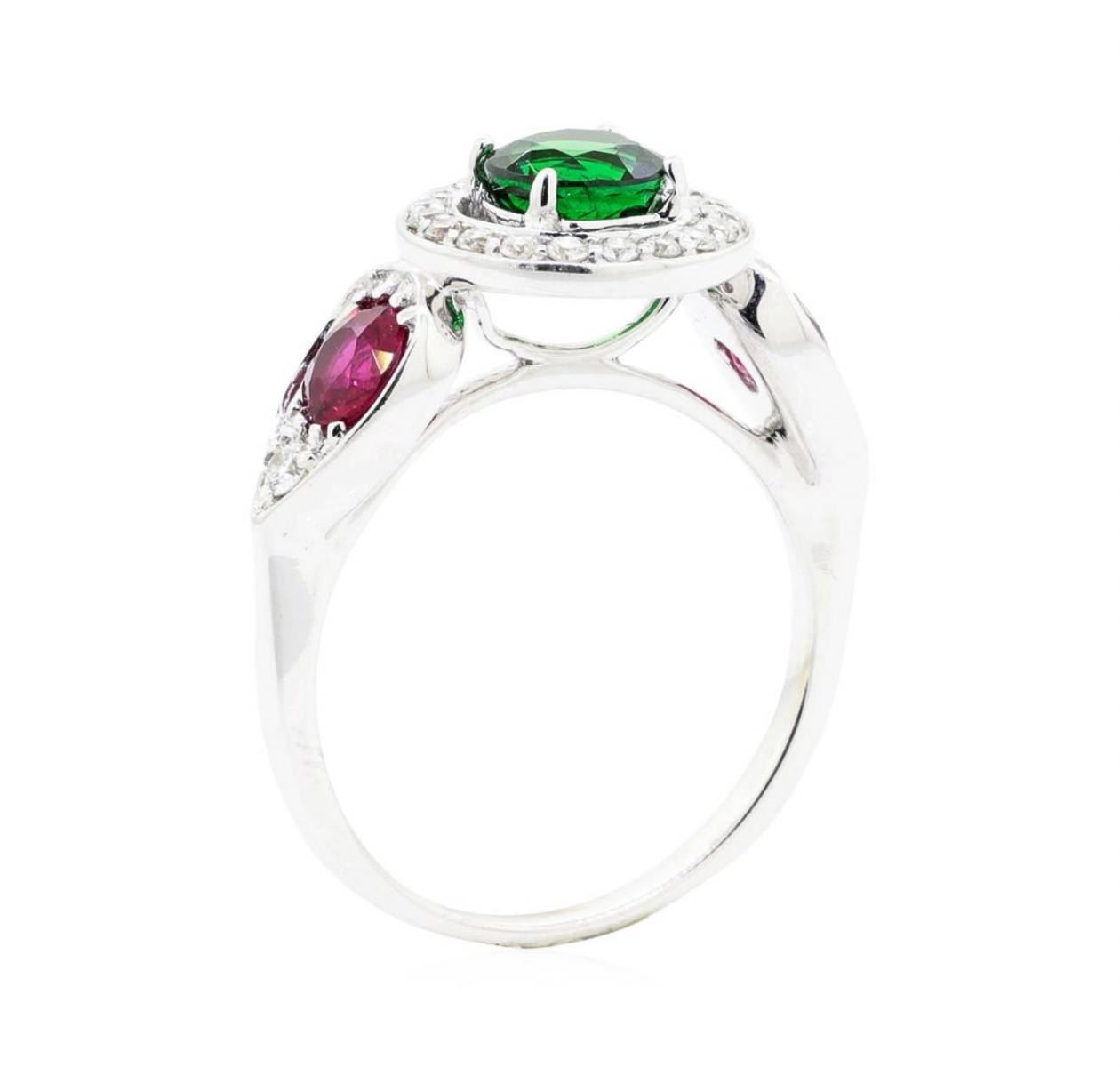 One electronically tested 18KT white gold lady's cast fashion ring with a three stone halo with a bright polish finish. The featured lady's ring has a shank measuring 1.45 millimeters wide. Identified with markings of '18K'. Condition is new, good workmanship. Containing: One prong set round modified mixed cut natural tsavorite garnet, measuring 5.36 - 5.32 x 3.60 mm, (depth est.) approximate weight of 0.80ct., clarity is eye clean, medium dark, strong, green color, (GIA G 6/5), cut is very good. Transmitting light with no distortion, transparent. Colored gemstones are presumed to have been subjected to commonly used enhancement processes. Graded in the setting. Two prong set round modified mixed cut natural rubies, measuring 4.30 - 4.25 x 2.78 mm, (depth est.) approximate total weight of 0.75ct., clarity is eye clean, medium dark, strong, red color, (GIA R 6/5), cut is very good. Transmitting light with no distortion, transparent. Colored gemstones are presumed to have been subjected to commonly used enhancement processes. Graded in the setting. Two prong set round brilliant cut diamonds, measuring 1.80 - 1.75 x 1.10mm (depth est.) approximate total weight of 2 Stones = 0.04ct. Graded in the setting. Color G - H Clarity VS-2 to SI-1 Cut Very Good Eighteen prong set round brilliant cut diamonds, measuring 1.30 - 1.25 x 0.79mm (depth est.) approximate total weight of 18 Stones = 0.14ct. Graded in the setting. Color G - H Clarity VS-2 to SI-1 Cut Very Good. Total Weight of Colored Stones 1.55ct.. Total Weight of Diamonds 0.18ct.. Total Weight of Ring 4.10gm GAS Appraised at $4100.00. GAS Appraised.