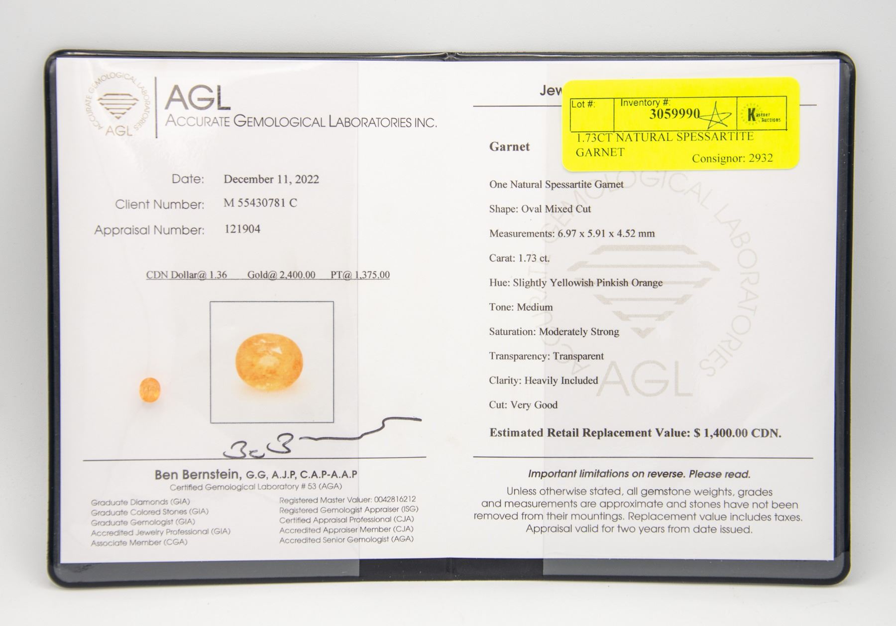 OVAL MIXED CUT, MEASURING 6.97X 5.91 X 4.52mm, HUE IS SLIGHTLY YELLOWISH PINKISH ORANGE, TONE IS MEDIUM, SATURATION IS MODERATELY STRONG, STONE IS TRANSPARENT, CLARITY IS HEAVILY INCLUDED, CUT IS VERY GOOD. COMES WITH AGL APPRAISAL WITH ESTIMATED RETAIL REPLACEMENT VALUE OF $1400.00 **ALL ITEMS MUST BE REMOVED BY 5PM SATURDAY, MARCH 11TH 2023. ALL REMAINING ITEMS WILL BE SUBJECT TO A $6.00 PER DAY STORAGE CHARGE. ANY ITEMS REMAINING AFTER MONDAY, MARCH 27TH, 2023 WILL BE CONSIDERED FORFEITED. NO REFUNDS WILL BE ISSUED FOR FORFEITED ITEMS. TO SCHEDULE A PICK UP APPOINTMENT CLICK HERE
