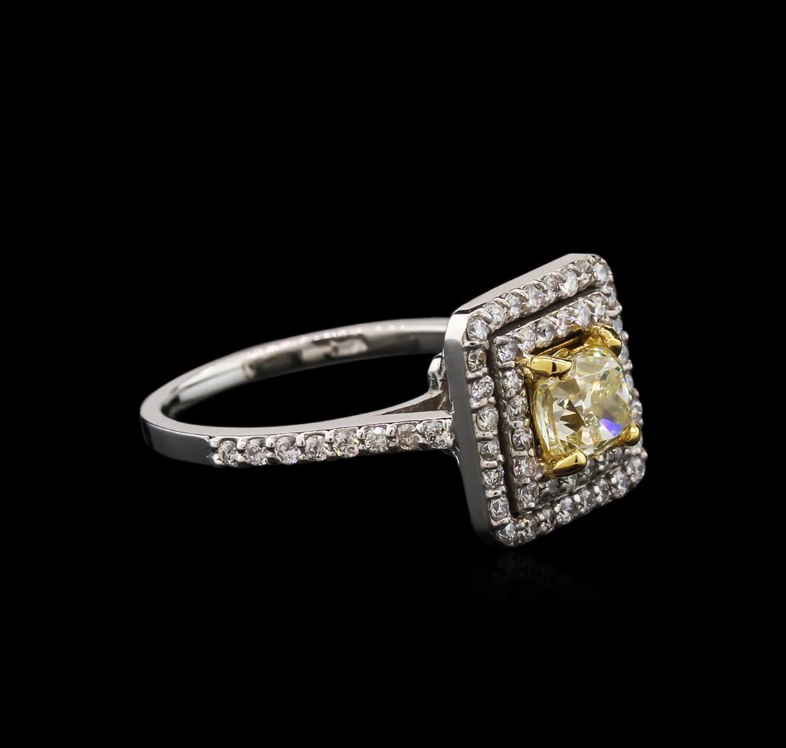 One electronically tested 14KT white and yellow gold lady's combination cast & assembled double halo ring with a cathedral shank with a bright polish finish. The featured lady's ring has a shank measuring 1.52 millimeters wide. Identified with markings of "14K". Condition is new, good workmanship. Containing: One prong set cushion cut diamond, measuring 5.47 x 5.14 x 3.60mm (depth est.) , 20.00.%. GTCF approximate weight of 1.08ct. Graded in the setting. Clarity: VS-2 Cut Very Good Sixty-Four prong set round brilliant cut diamonds, measuring 1.40 - 1.30 x 0.88mm (depth est.) approximate total weight of 64 Stones = 0.65ct. Graded in the setting. Clarity: VS-2 to SI-2. Color: H - I. Cut Good. Total Weight of Diamonds 1.73ct. Total Weight of Ring 4.70gm. GAS Appraised at $17,990.00.