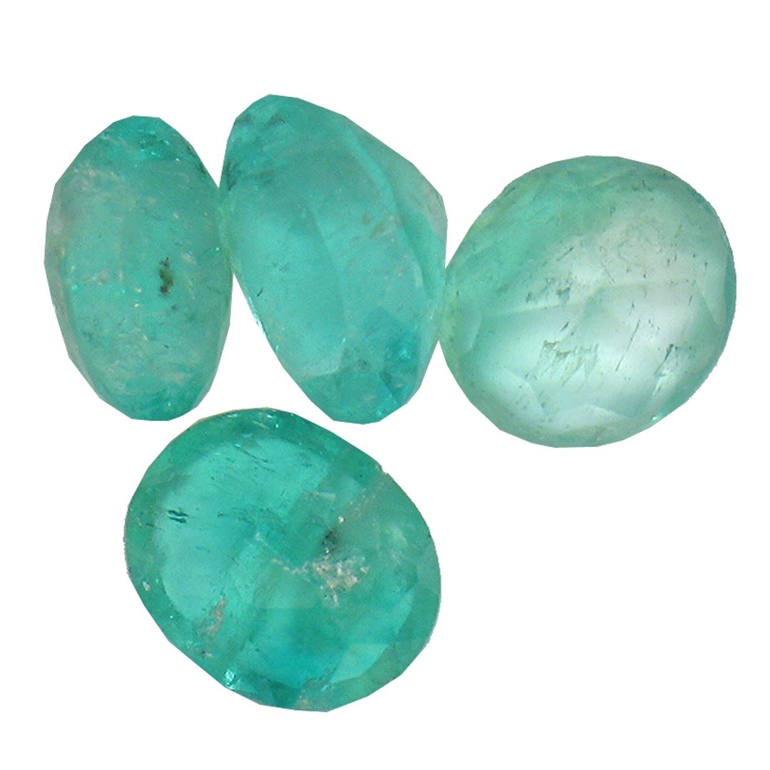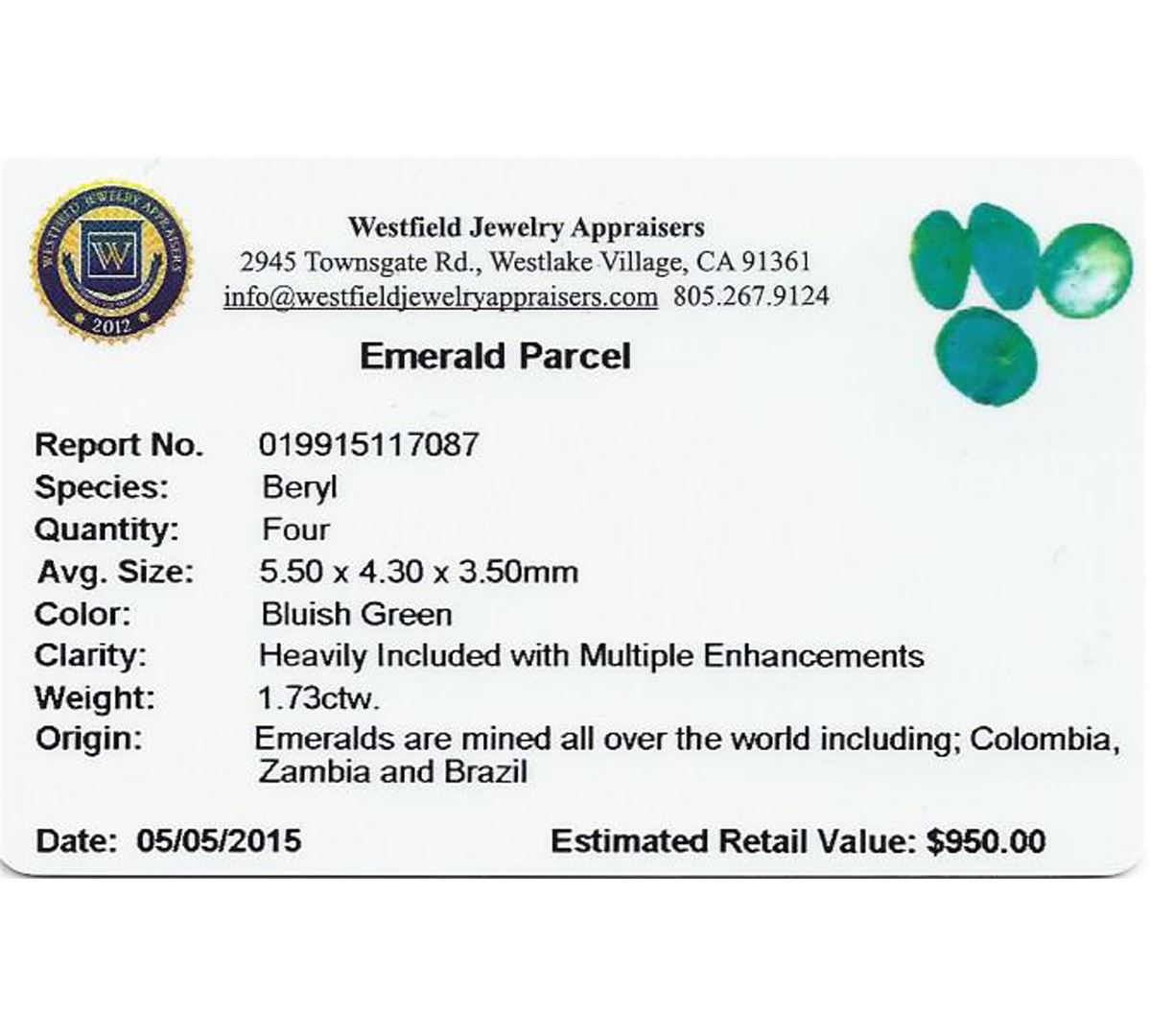 Four oval mixed cut natural emeralds, measuring 5.50 x 4.30 x 3.50mm, approximate total weight of 1.73ct., clarity is moderately included, type III, medium dark, moderately strong, bluish green color, (GIA bG 6/4), cut is good. Indications of multiple laboratory enhancements, including high temperature heat treatment. Westfield Appraised at $950.00.