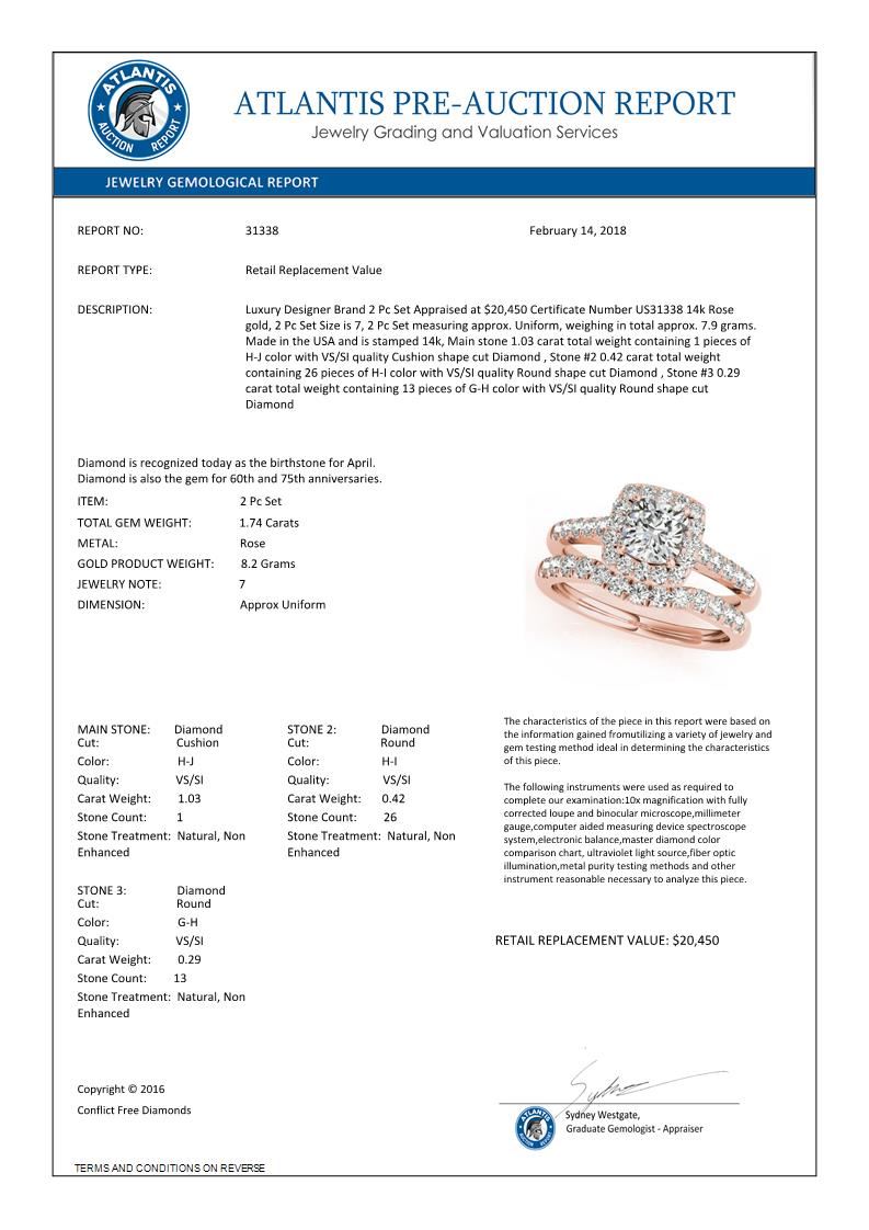 REF-464W4F -31338 ---- 1.74 CTW Certified VS/SI Cushion Diamond 2Pc Set Solitaire Halo 14K Rose Gold ---- Luxury Designer Brand 2 Pc Set Appraised at $20,450 Certificate Number US31338 14k Rose gold, 2 Pc Set Size is 7, 2 Pc Set measuring approx. Uniform, weighing in total approx. 7.9 grams. Made in the USA and is stamped 14k, Main stone 1.03 carat total weight containing 1 pieces of H-J color with VS/SI quality Cushion shape cut Diamond , Stone #2 0.42 carat total weight containing 26 pieces of H-I color with VS/SI quality Round shape cut Diamond , Stone #3 0.29 carat total weight containing 13 pieces of G-H color with VS/SI quality Round shape cut Diamond