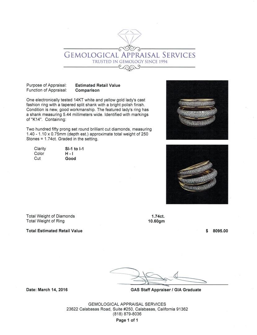 One electronically tested 14KT white and yellow gold lady's cast fashion ring with a tapered split shank with a bright polish finish. The featured lady's ring has a shank measuring 5.44 millimeters wide. Identified with markings of "K14". Condition is new, good workmanship. Containing: Two Hundred Fifty prong set round brilliant cut diamonds, measuring 1.40 - 1.10 x 0.75mm (depth est.) approximate total weight of 250 Stones = 1.74ct. Graded in the setting. Clarity: SI-1 to I-1. Color: H - I. Cut Good. Total Weight of Diamonds 1.74ct. Total Weight of Ring 10.60gm. GAS Appraised at $8,095.00.
