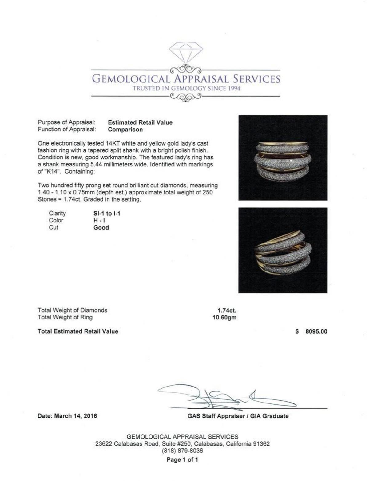 One electronically tested 14KT white and yellow gold lady's cast fashion ring with a tapered split shank with a bright polish finish. The featured lady's ring has a shank measuring 5.44 millimeters wide. Identified with markings of "K14". Condition is new, good workmanship. Containing: Two Hundred Fifty prong set round brilliant cut diamonds, measuring 1.40 - 1.10 x 0.75mm (depth est.) approximate total weight of 250 Stones = 1.74ct. Graded in the setting. Clarity: SI-1 to I-1. Color: H - I. Cut Good. Total Weight of Diamonds 1.74ct. Total Weight of Ring 10.60gm. GAS Appraised.