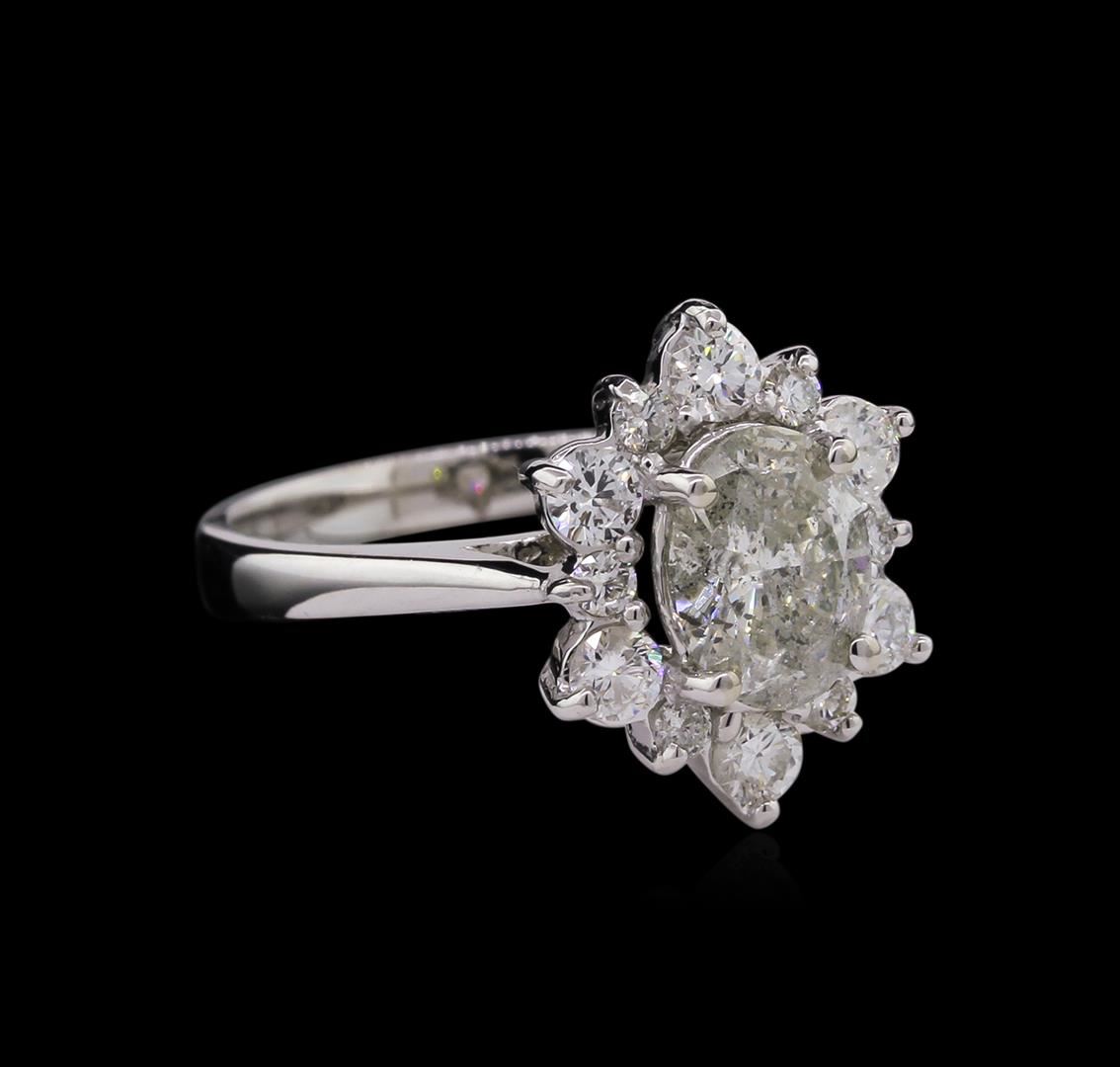 One electronically tested 14KT white gold lady's cast wedding ring with a basket halo with a bright polish finish. The featured lady's ring has a shank measuring 2.86 millimeters wide. Identified with markings of "K14". Condition is new, good workmanship. Containing: One prong set oval shaped cut diamond, measuring 7.90 x 6.06 x 3.51mm (depth est.) , 3.00.%. GTCF approximate weight of 1.10ct. Graded in the setting. Clarity: I-2. Color: J - Good Six prong set round brilliant cut diamonds, measuring 2.80 - 2.75 x 1.72mm (depth est.) approximate total weight of 6 Stones = 0.48ct. Graded in the setting. Clarity: SI-1 to SI-2. Color: G - Very Good Six prong set round brilliant cut diamonds, measuring 2.00 - 1.90 x 1.17mm (depth est.) approximate total weight of 6 Stones = 0.16ct. Graded in the setting. Clarity: SI-1 to SI-2. Color: G - Good. Total Weight of Diamonds 1.74ct. Total Weight of Ring 4.30gm. GAS Appraised at $6,550.00.