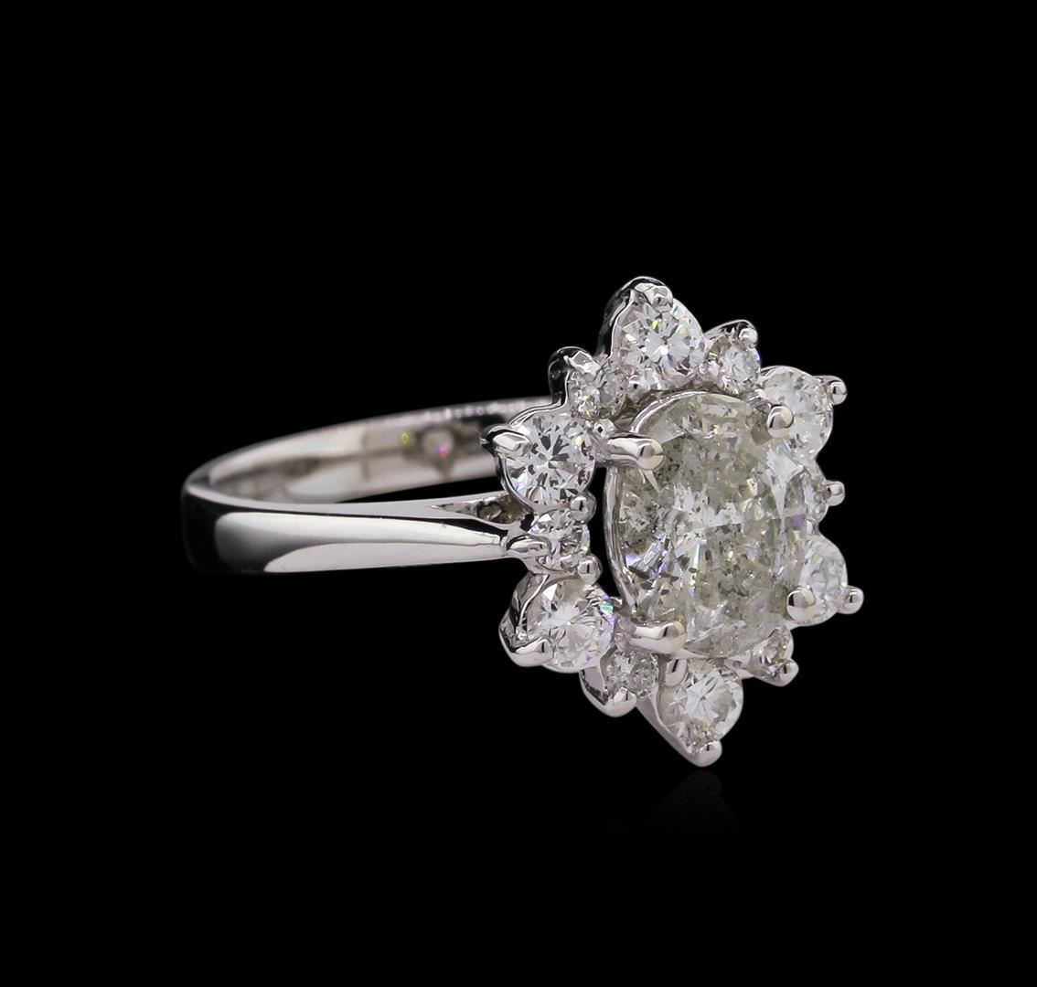 One electronically tested 14KT white gold lady's cast wedding ring with a basket halo with a bright polish finish. The featured lady's ring has a shank measuring 2.86 millimeters wide. Identified with markings of "K14". Condition is new, good workmanship. Containing: One prong set oval shaped cut diamond, measuring 7.90 x 6.06 x 3.51mm (depth est.) , 3.00.%. GTCF approximate weight of 1.10ct. Graded in the setting. Clarity: I-2. Color: J - Good Six prong set round brilliant cut diamonds, measuring 2.80 - 2.75 x 1.72mm (depth est.) approximate total weight of 6 Stones = 0.48ct. Graded in the setting. Clarity: SI-1 to SI-2. Color: G - Very Good Six prong set round brilliant cut diamonds, measuring 2.00 - 1.90 x 1.17mm (depth est.) approximate total weight of 6 Stones = 0.16ct. Graded in the setting. Clarity: SI-1 to SI-2. Color: G - Good. Total Weight of Diamonds 1.74ct. Total Weight of Ring 4.30gm. GAS Appraised.