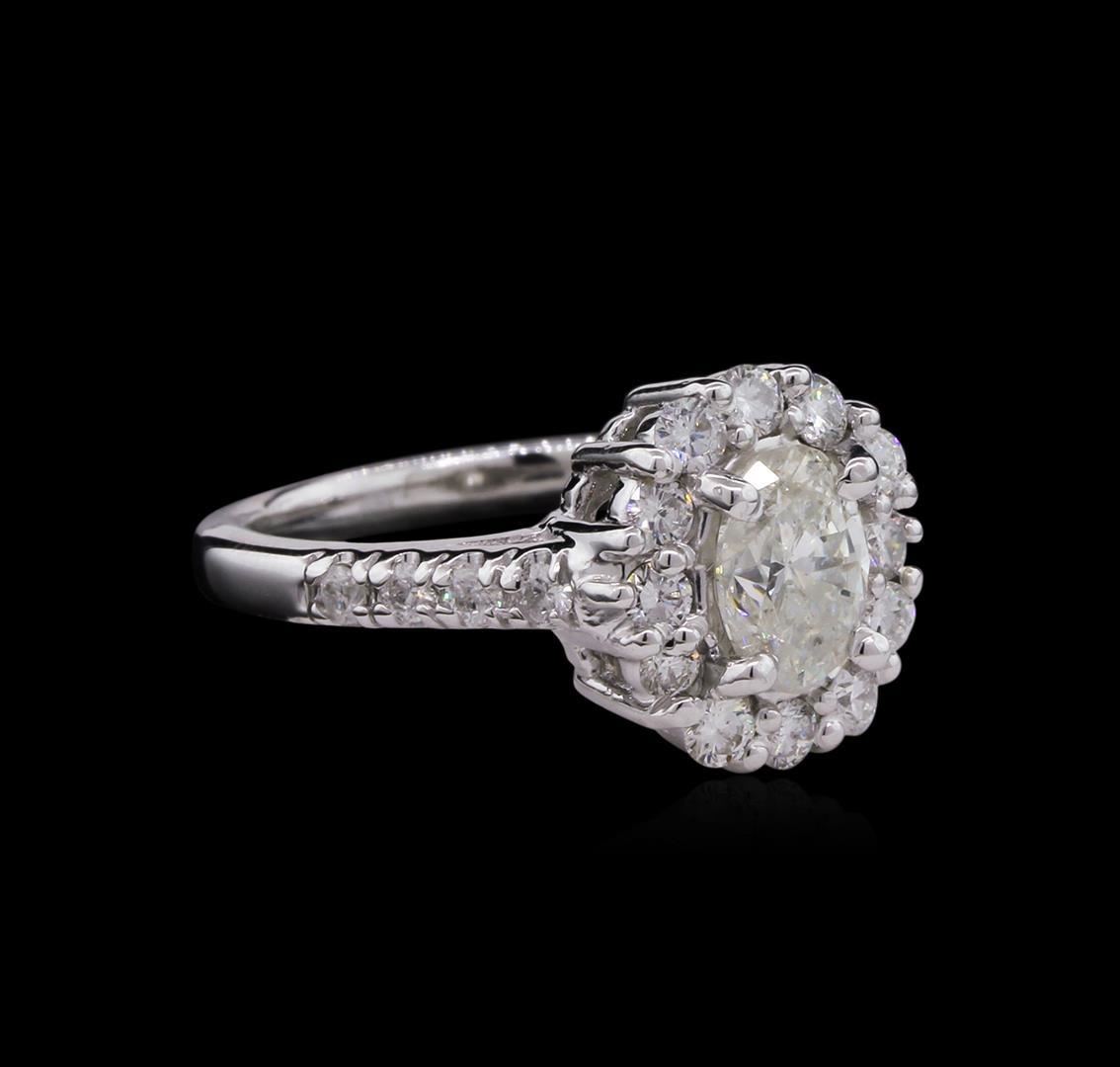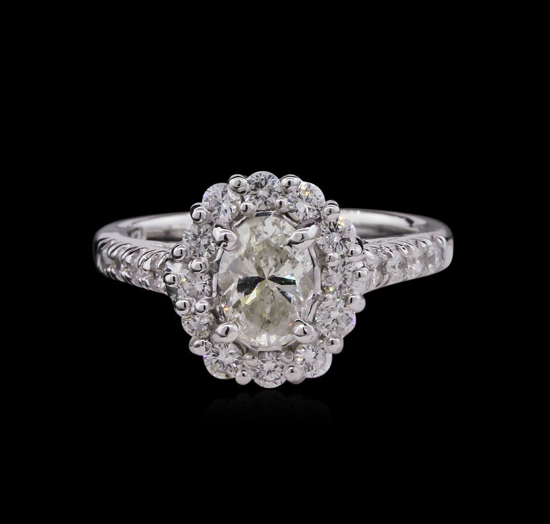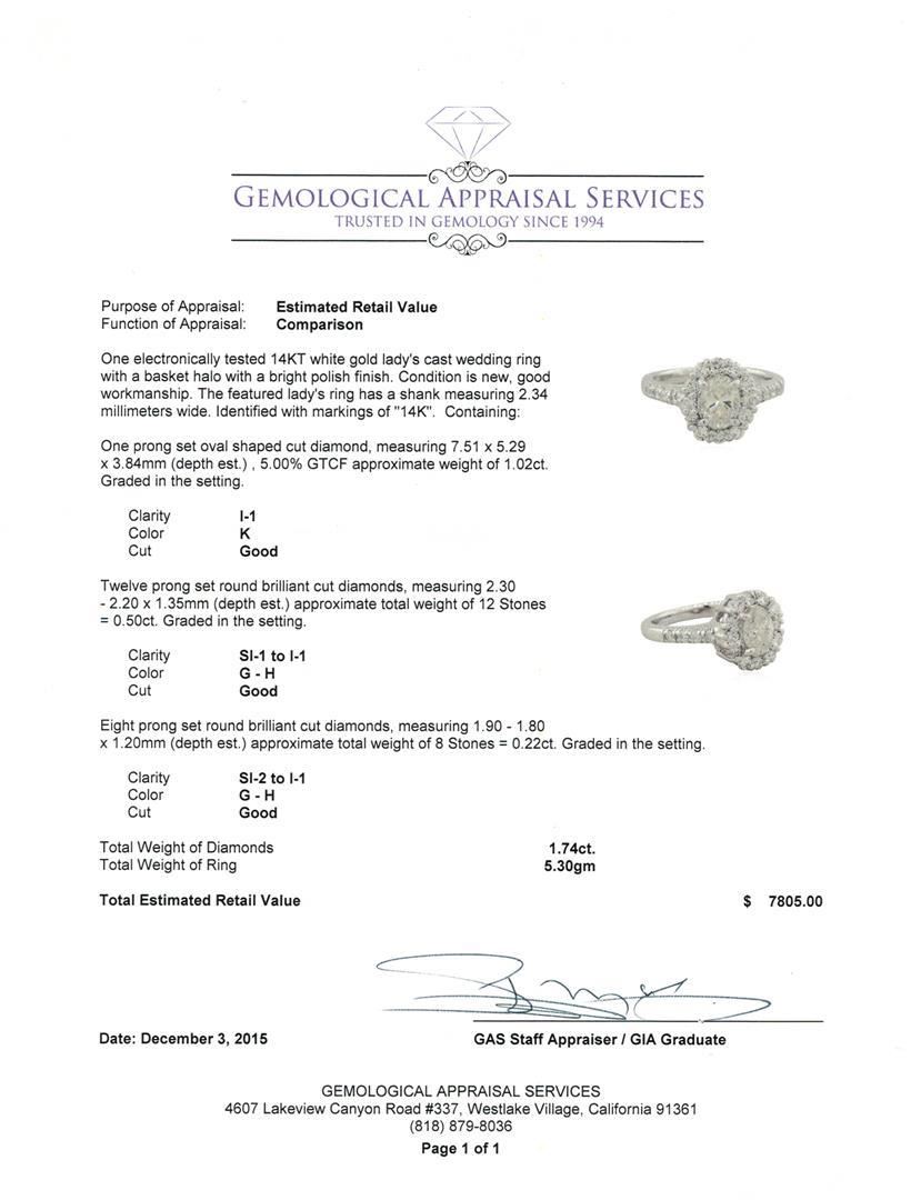 One electronically tested 14KT white gold lady's cast wedding ring with a basket halo with a bright polish finish. The featured lady's ring has a shank measuring 2.34 millimeters wide. Identified with markings of "14K". Condition is new, good workmanship. Containing: One prong set oval shaped cut diamond, measuring 7.51 x 5.29 x 3.84mm (depth est.) , 5.00.%. GTCF approximate weight of 1.02ct. Graded in the setting. Clarity: I-1. Color: Good Twelve prong set round brilliant cut diamonds, measuring 2.30 - 2.20 x 1.35mm (depth est.) approximate total weight of 12 Stones = 0.50ct. Graded in the setting. Clarity: SI-1 to I-1. Color: G - Good Eight prong set round brilliant cut diamonds, measuring 1.90 - 1.80 x 1.20mm (depth est.) approximate total weight of 8 Stones = 0.22ct. Graded in the setting. Clarity: SI-2 to I-1. Color: G - Good. Total Weight of Diamonds 1.74ct. Total Weight of Ring 5.30gm. GAS Appraised.