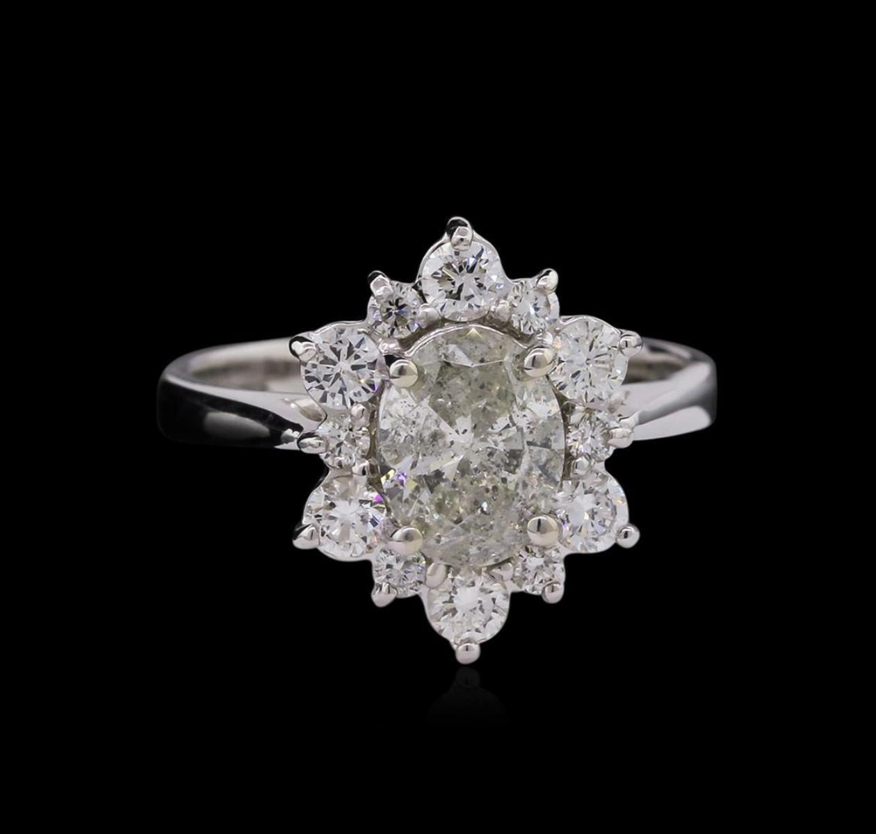 One electronically tested 14KT white gold lady's cast wedding ring with a basket halo with a bright polish finish. The featured lady's ring has a shank measuring 2.86 millimeters wide. Identified with markings of "K14". Condition is new, good workmanship. Containing: One prong set oval shaped cut diamond, measuring 7.90 x 6.06 x 3.51mm (depth est.) , 3.00.%. GTCF approximate weight of 1.10ct. Graded in the setting. Clarity: I-2. Color: J - Good Six prong set round brilliant cut diamonds, measuring 2.80 - 2.75 x 1.72mm (depth est.) approximate total weight of 6 Stones = 0.48ct. Graded in the setting. Clarity: SI-1 to SI-2. Color: G - Very Good Six prong set round brilliant cut diamonds, measuring 2.00 - 1.90 x 1.17mm (depth est.) approximate total weight of 6 Stones = 0.16ct. Graded in the setting. Clarity: SI-1 to SI-2. Color: G - Good. Total Weight of Diamonds 1.74ct. Total Weight of Ring 4.30gm. GAS Appraised.