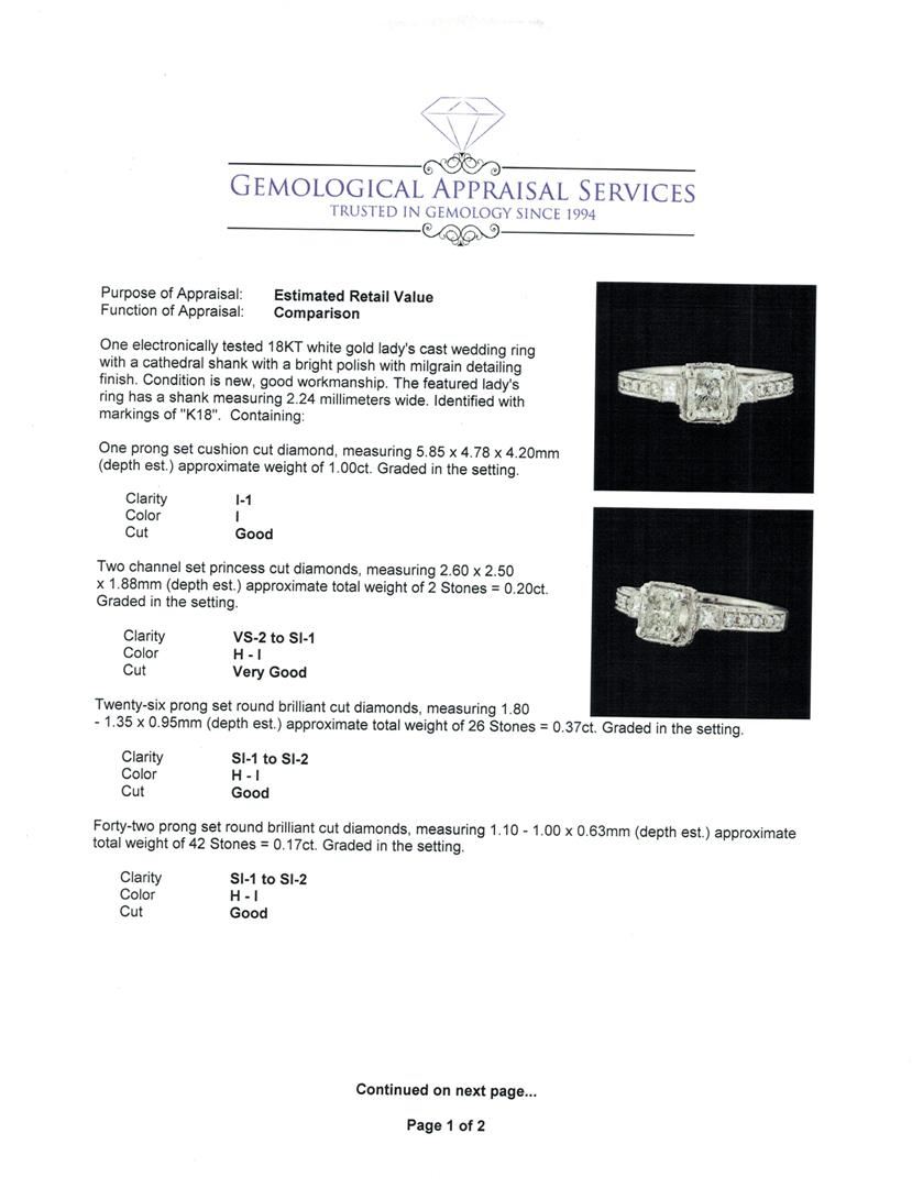 One electronically tested 18KT white gold lady's cast wedding ring with a cathedral shank with a bright polish with milgrain detailing finish. The featured lady's ring has a shank measuring 2.24 millimeters wide. Identified with markings of 'K18'. Condition is new, good workmanship. Containing: One prong set cushion cut diamond, measuring 5.85 x 4.78 x 4.20mm (depth est.) approximate weight of 1.00ct. Graded in the setting. Clarity I-1. Color: I Cut Good Two channel set princess cut diamonds, measuring 2.60 x 2.50 x 1.88mm (depth est.) approximate total weight of 2 Stones = 0.20ct. Graded in the setting. Clarity VS-2 to SI-1. Color: H - I Cut Very Good Twenty-Six prong set round brilliant cut diamonds, measuring 1.80 - 1.35 x 0.95mm (depth est.) approximate total weight of 26 Stones = 0.37ct. Graded in the setting. Clarity SI-1 to SI-2. Color: H - I Cut Good Forty-Two prong set round brilliant cut diamonds, measuring 1.10 - 1.00 x 0.63mm (depth est.) approximate total weight of 42 Stones = 0.17ct. Graded in the setting. Clarity SI-1 to SI-2. Color: H - I Cut Good. Total Weight of Diamonds 1.74ct.. Total Weight of Ring 5.90gm. GAS Appraised at $9,385.00.