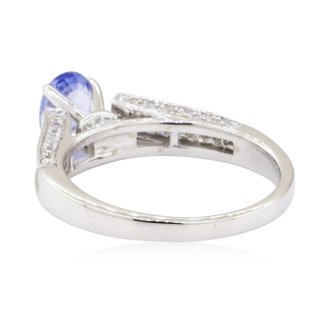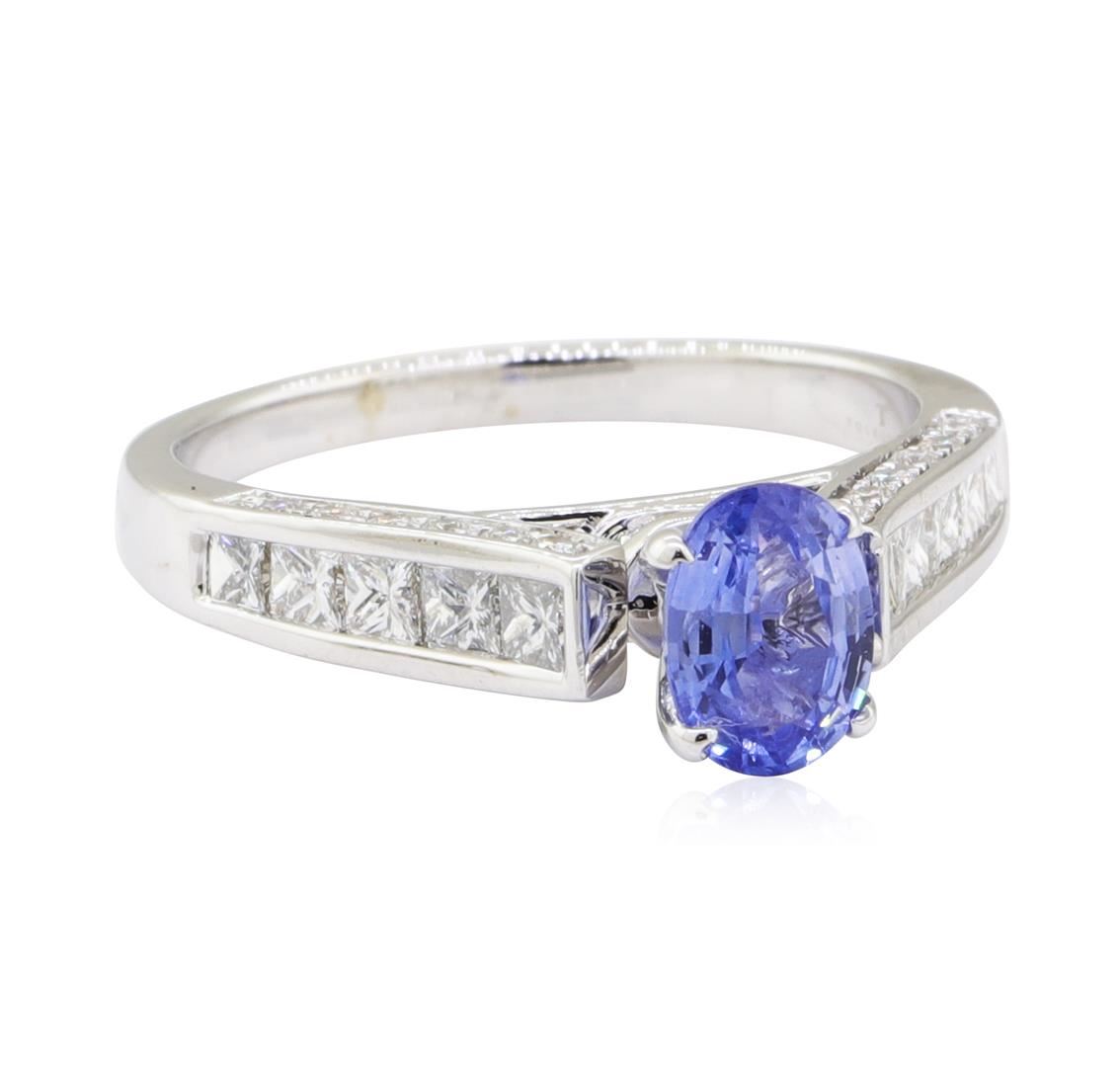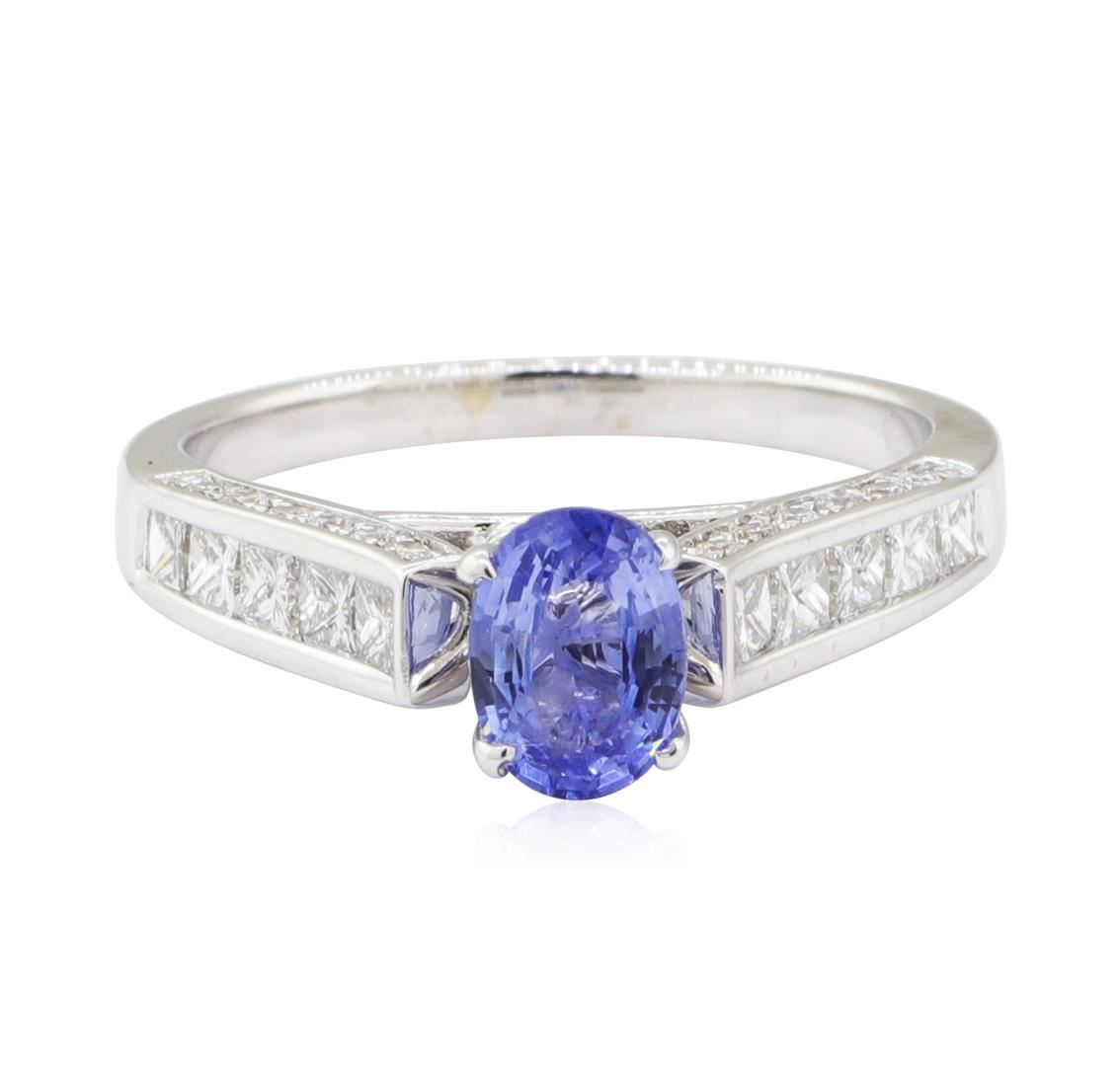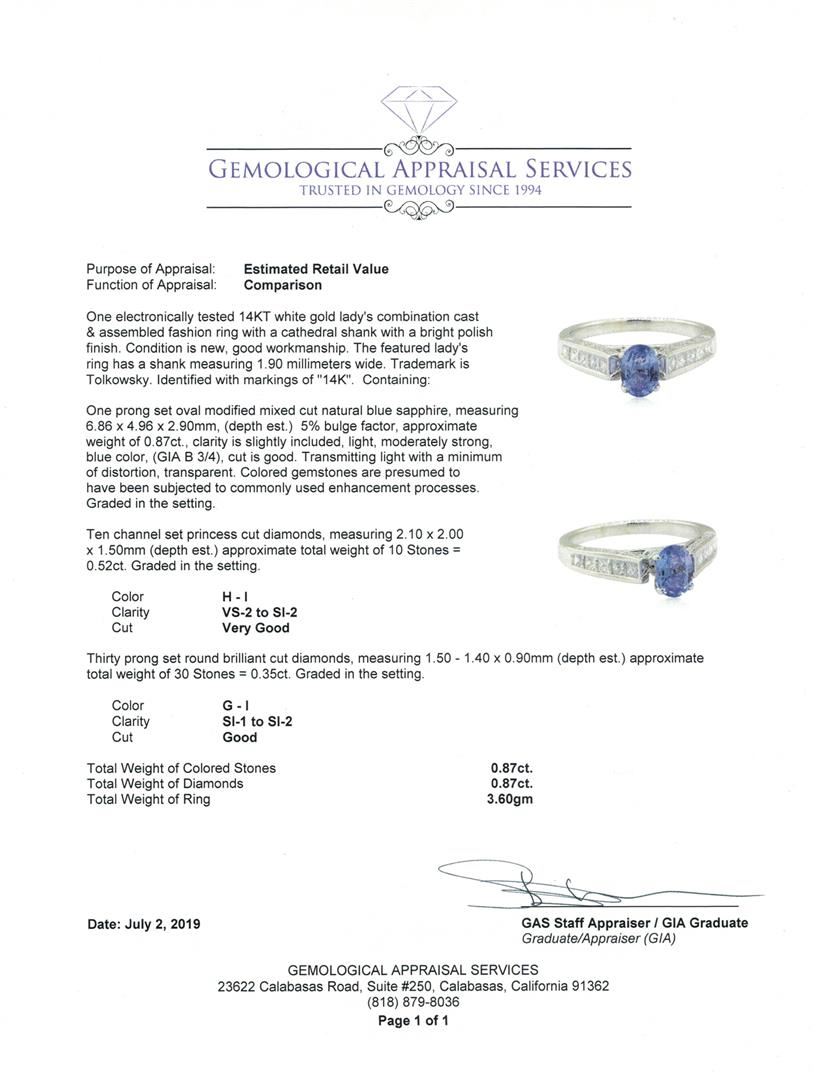 One electronically tested 14KT white gold lady's combination cast & assembled fashion ring with a cathedral shank with a bright polish finish. The featured lady's ring has a shank measuring 1.90 millimeters wide. Trademark is Tolkowsky. Identified with markings of '14K'. Condition is new, good workmanship. Containing: One prong set oval modified mixed cut natural blue sapphire, measuring 6.86 x 4.96 x 2.90mm, (depth est.) 5%. bulge factor, approximate weight of 0.87ct., clarity is slightly included, light, moderately strong, blue color, (GIA B 3/4), cut is good. Transmitting light with a minimum of distortion, transparent. Colored gemstones are presumed to have been subjected to commonly used enhancement processes. Graded in the setting. Ten channel set princess cut diamonds, measuring 2.10 x 2.00 x 1.50mm (depth est.) approximate total weight of 10 Stones = 0.52ct. Graded in the setting. Color H - I Clarity VS-2 to SI-2 Cut Very Good Thirty prong set round brilliant cut diamonds, measuring 1.50 - 1.40 x 0.90mm (depth est.) approximate total weight of 30 Stones = 0.35ct. Graded in the setting. Color G - I Clarity SI-1 to SI-2 Cut Good. Total Weight of Colored Stones 0.87ct.. Total Weight of Diamonds 0.87ct.. Total Weight of Ring 3.60gm GAS Appraised at $2815.00. GAS Appraised at $2,815.00.