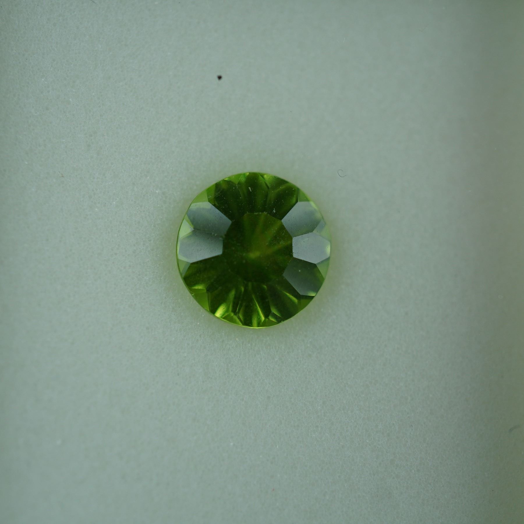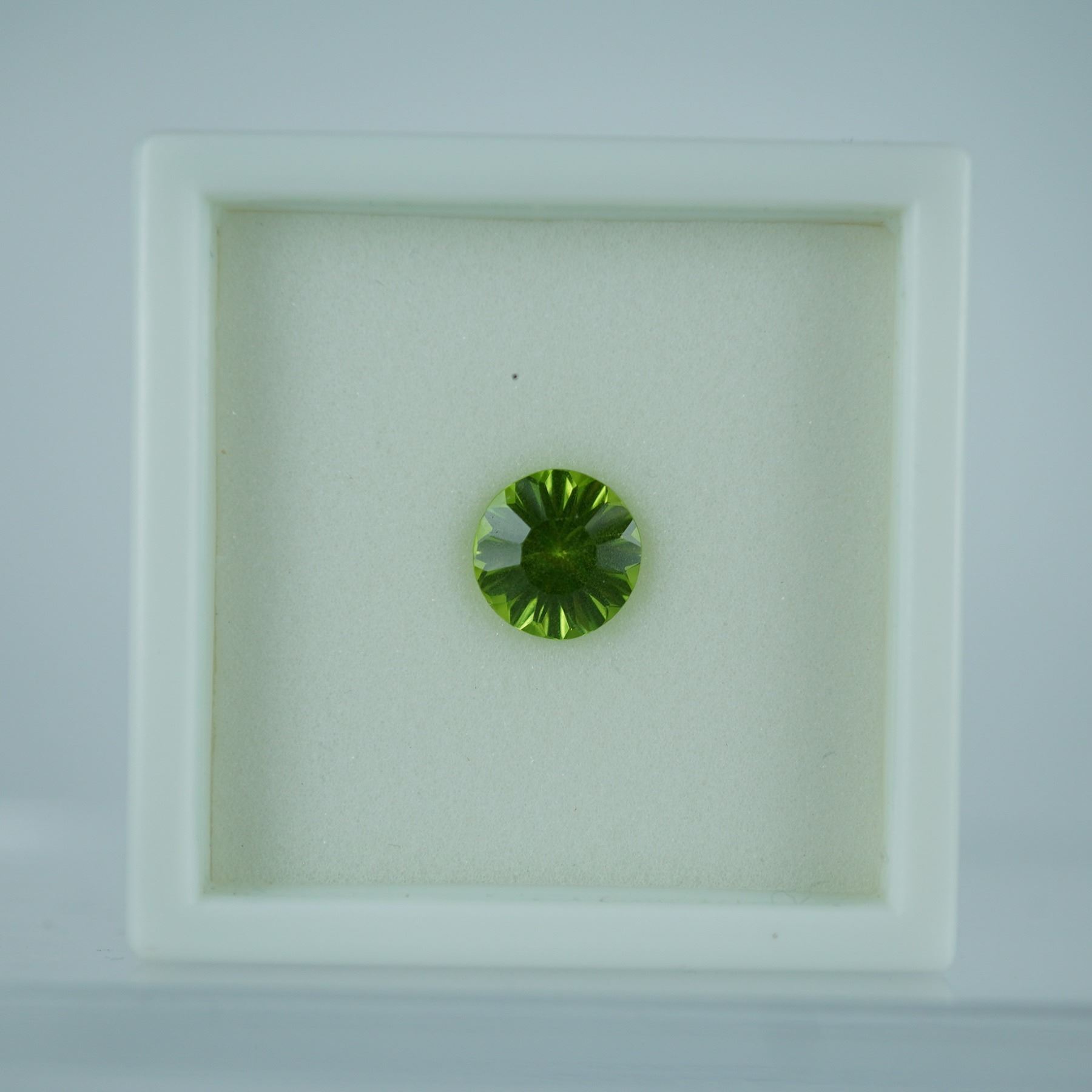 Vivid 1.75 carat peridot gemstone showcasing a unique quantum cut, enhancing its brilliance with intricate, precision-cut facets. This round gem features a bright, lime-green hue typical of quality peridot, prized for its refreshing and vibrant color. The stone is presented in a protective case, ready for custom jewelry design or collection.
