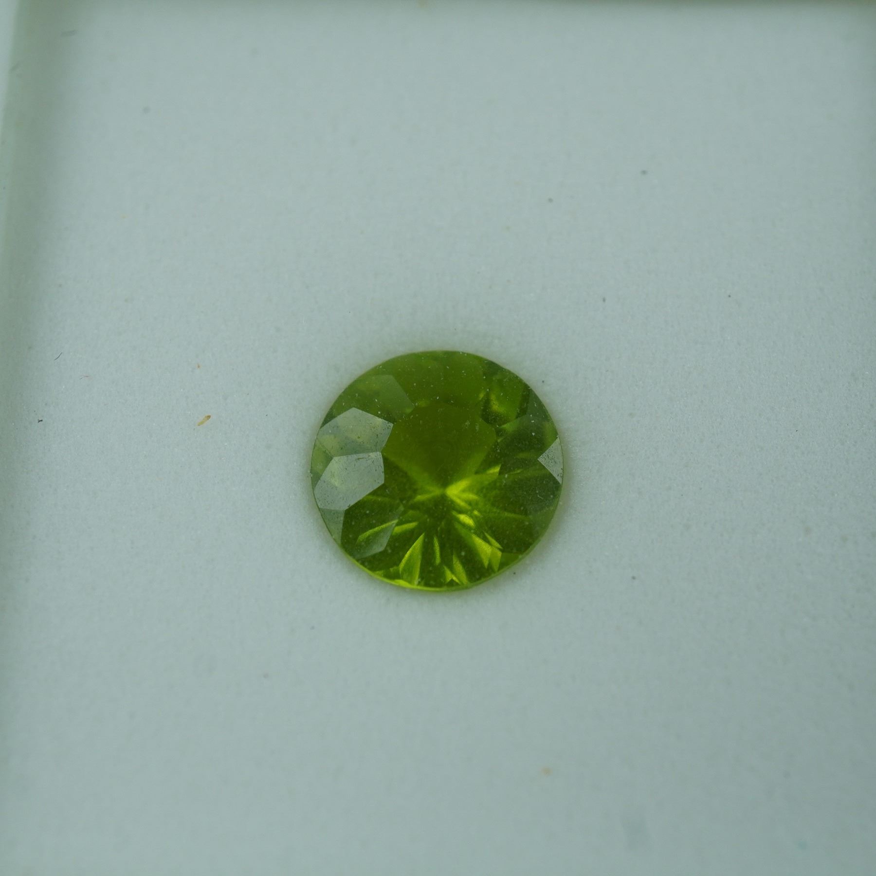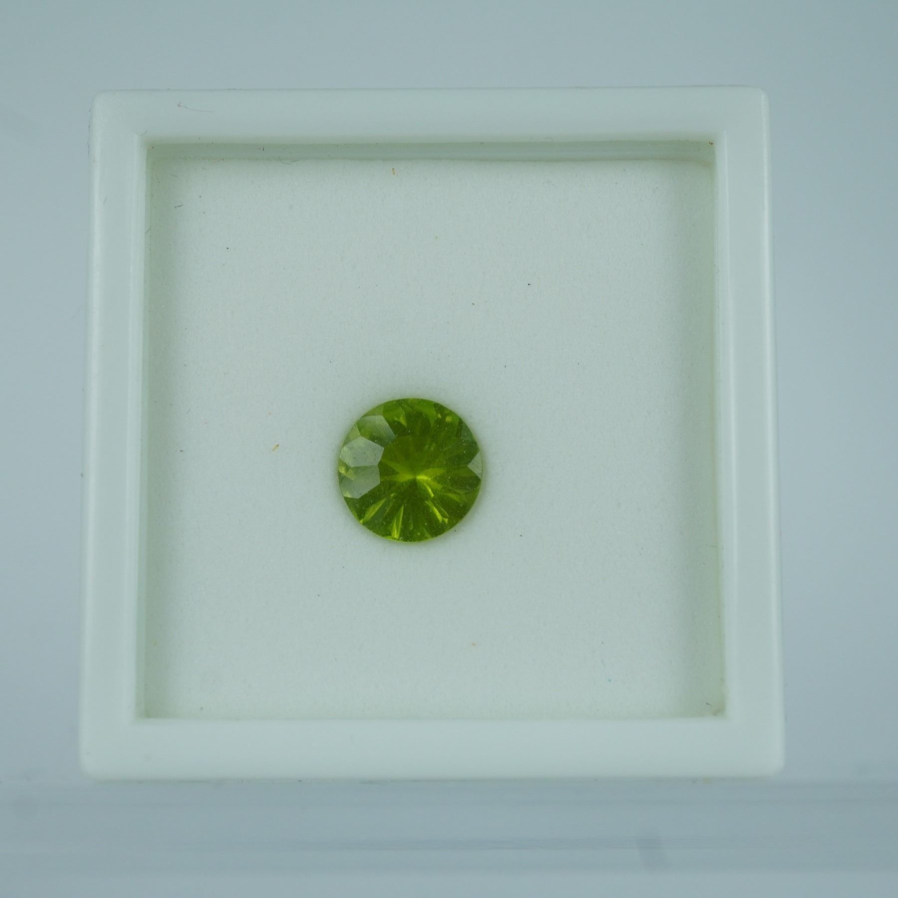 This vibrant green peridot showcases a brilliant round quantum cut, designed to enhance its sparkle and optical performance. With an approximate weight of 1.75 carats and a classic 8 mm round shape, this gem is a versatile choice for elegant and contemporary jewelry. It is housed in a protective case to preserve its condition.