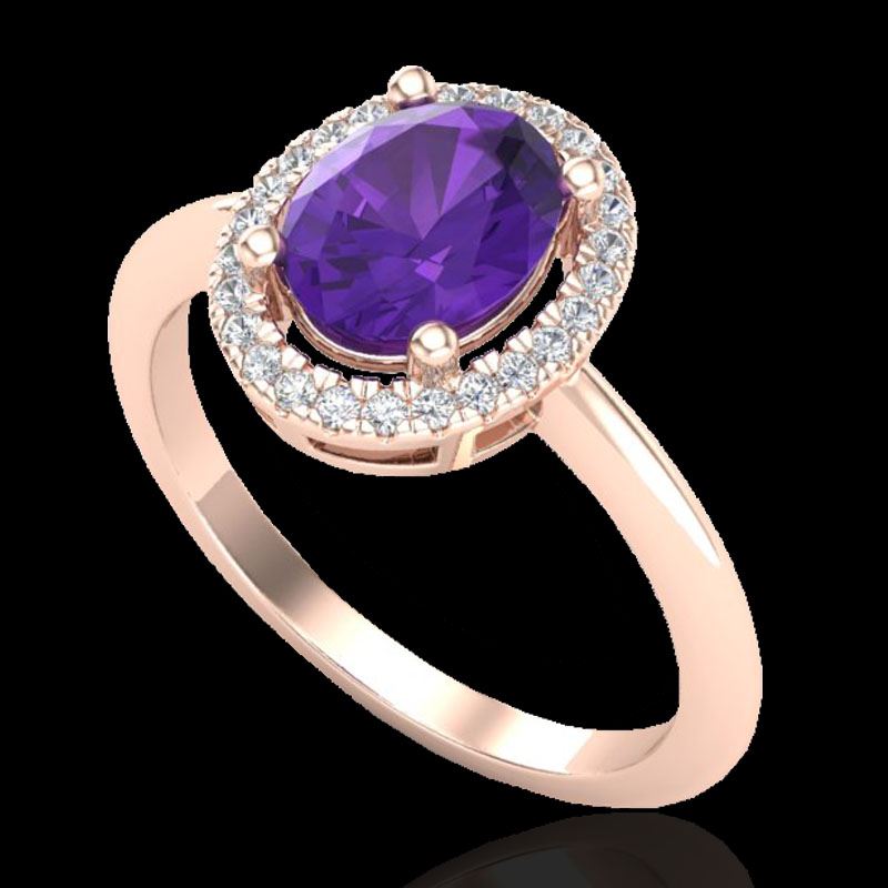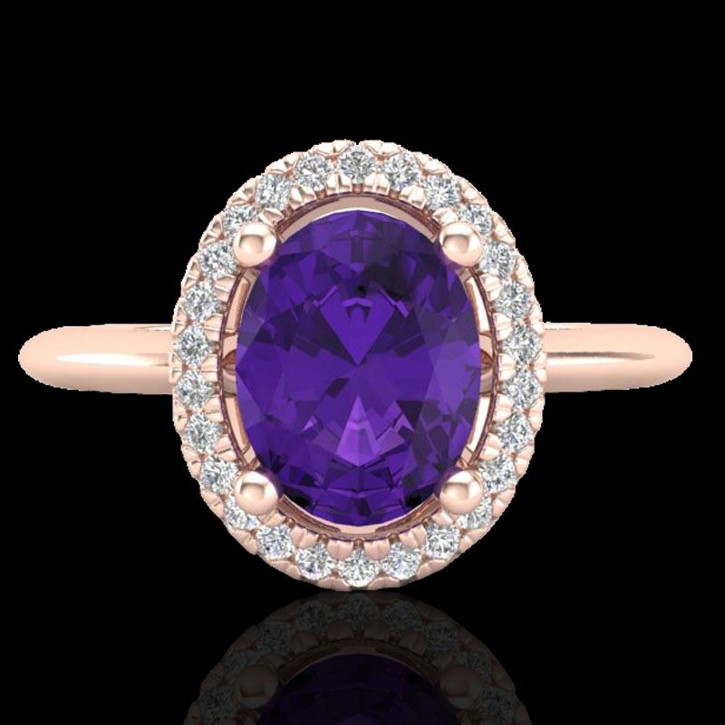 REF-40H2A -20997 ---- 1.75 CTW Amethyst & Micro VS/SI Diamond Ring Solitaire Halo 14K Rose Gold ---- Luxury Designer Brand Ring Appraised at $2,650 Certificate Number US20997 14k Rose gold, Ring Size is 7, Ring measuring approx. 1/2" X 1/2" , weighing in total approx. 3.5 grams. Made in the USA and is stamped 14k, Main stone 1.52 carat total weight containing 1 pieces of Intense Translucent Purple color with AAA quality Oval shape cut Amethyst , Stone #2 0.23 carat total weight containing 27 pieces of H-I color with VS/SI quality Round shape cut Diamond