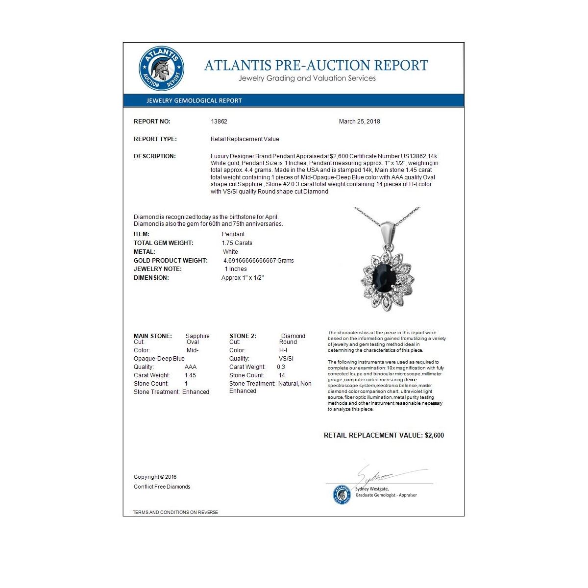 REF-42W8F -13862 ---- 1.75 CTW Blue Sapphire & Diamond Pendant 14K White Gold ---- Luxury Designer Brand Pendant Appraised at $2,600 Certificate Number US13862 14k White gold, Pendant Size is 1 Inches, Pendant measuring approx. 1" x 1/2", weighing in total approx. 4.4 grams. Made in the USA and is stamped 14k, Main stone 1.45 carat total weight containing 1 pieces of Mid-Opaque-Deep Blue color with AAA quality Oval shape cut Sapphire , Stone #2 0.3 carat total weight containing 14 pieces of H-I color with VS/SI quality Round shape cut Diamond